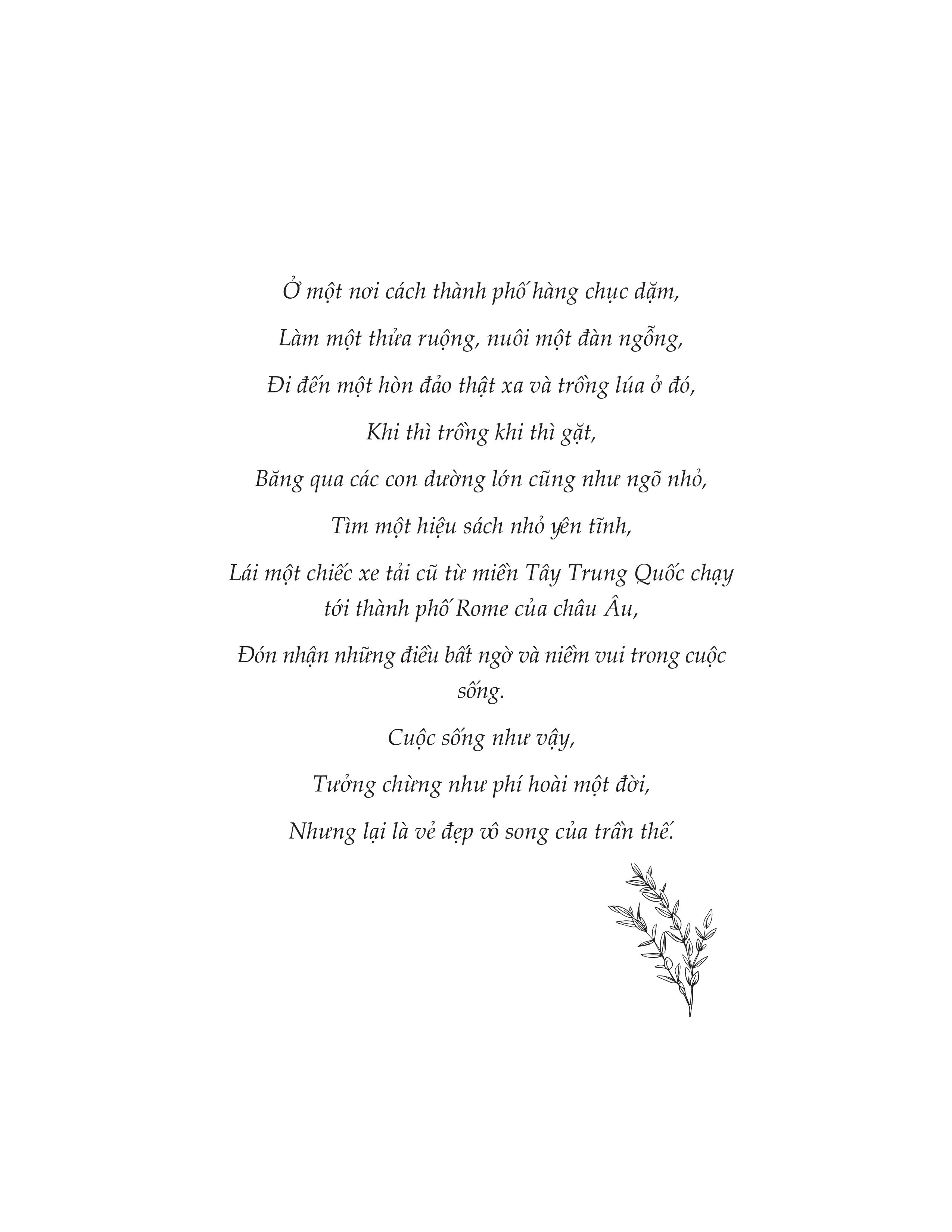 Cuộc đời giống như một chuyến đi dài. Mỗi chuyến đi trên hành trình cuộc sống là sự giao tiếp giữa con người với thiên nhiên, giao tiếp giữa những con người chưa từng quen biết, đối thoại với nhau và đối thoại với chính mình. Làm điều mình thích là tự do, thích điều mình làm là hạnh phúc mang đầy tính nhân văn, tinh tế, ấm áp và đầy thi vị. Những khung cảnh thiên nhiên, lối sống, văn hóa được miêu tả trong cuốn sách dường như là một cuộc sống đáng mơ ước, nhưng bất kỳ ai cũng có thể đạt được. Những thông điệp được truyền tải thông qua cuốn sách giúp người đọc có thể tìm ra cho mình con đường phù hợp nhất để có được niềm vui mỗi ngày. Hãy cứ đi và cảm nhận. Đi để mở rộng lòng mình với vạn vật, với cuộc đời.
