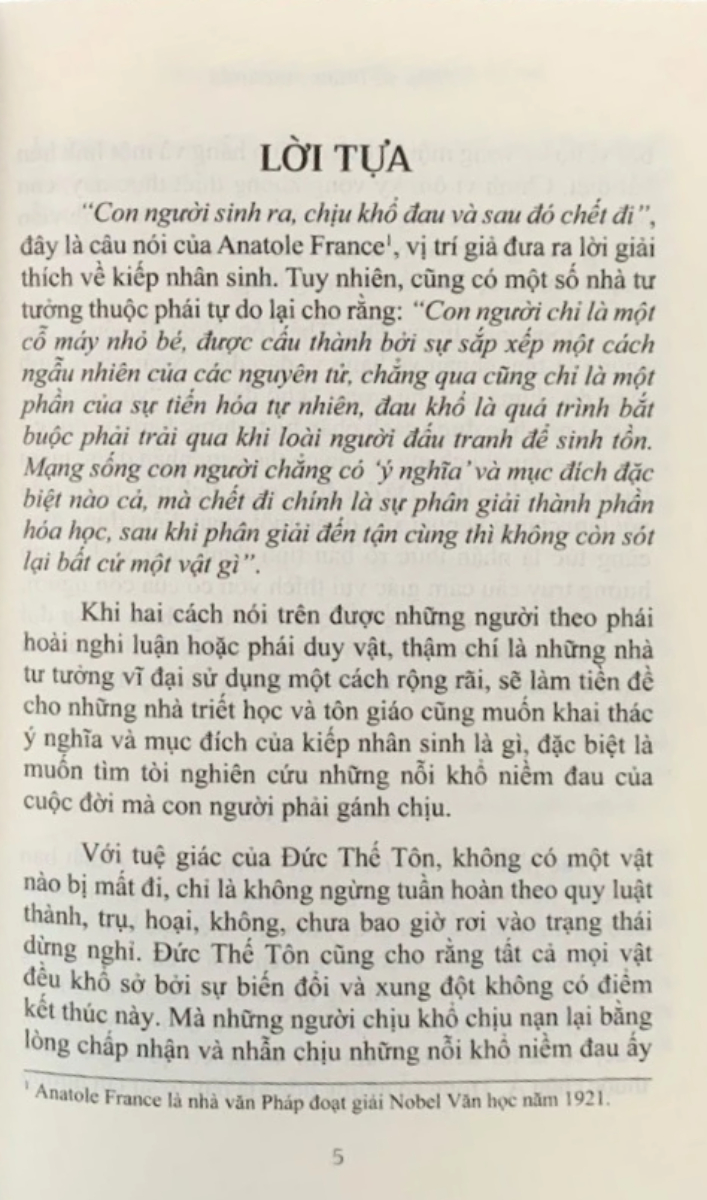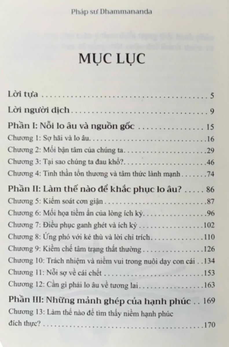 Cuốn sách gồm bốn phần này bàn luận về những vấn đề muôn thuở của con người như: Tại sao chúng ta đau khổ? Làm thế nào để khắc phục lo âu? Cách để tìm bình yêu giữa những tranh đấu và xung đột; Giá trị của tình yêu thương; v.v. Thông qua cuốn sách, Pháp sư Dhammananda đã bóc tách bản chất tham lam - nguồn gốc của mọi thói xấu; khuynh hướng truy cầu cảm giác vui thích, đồng thời cũng nêu lên những phẩm đức tốt đẹp đang đợi để khai quật của con người để từ đó đưa ra lời khuyên giúp con người trong thời đại hiện nay có thể khơi thông con kênh chứa những dòng nước bình an, tự tại, dẫn tới một thế giới yên ổn, hòa bình.