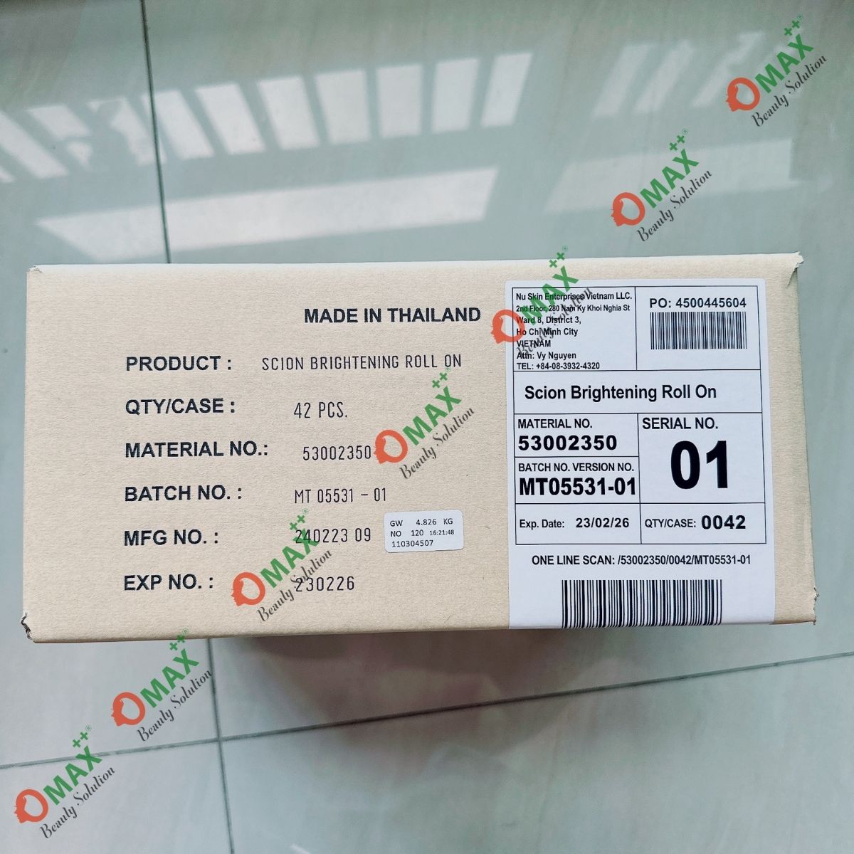 - Thông tin sản phẩm Sản phẩm: Lăn khử mùi Scion Brightening Roll On Thể tích: 75ml Số lượng: 01 chai Thương hiệu: NU SKIN Số giấy xác nhận nội dung quảng cáo của Sở Y Tế TP. Hồ Chí Minh: 784/2022/XNQC-YTHCM Số tiếp nhận Phiếu công bố: 154847/21/CBMP-QLD Xuất xứ: Mỹ / Thái lan ( Công dụng như nhau, khác nơi sản xuất còn tùy bạn lựa chọn )