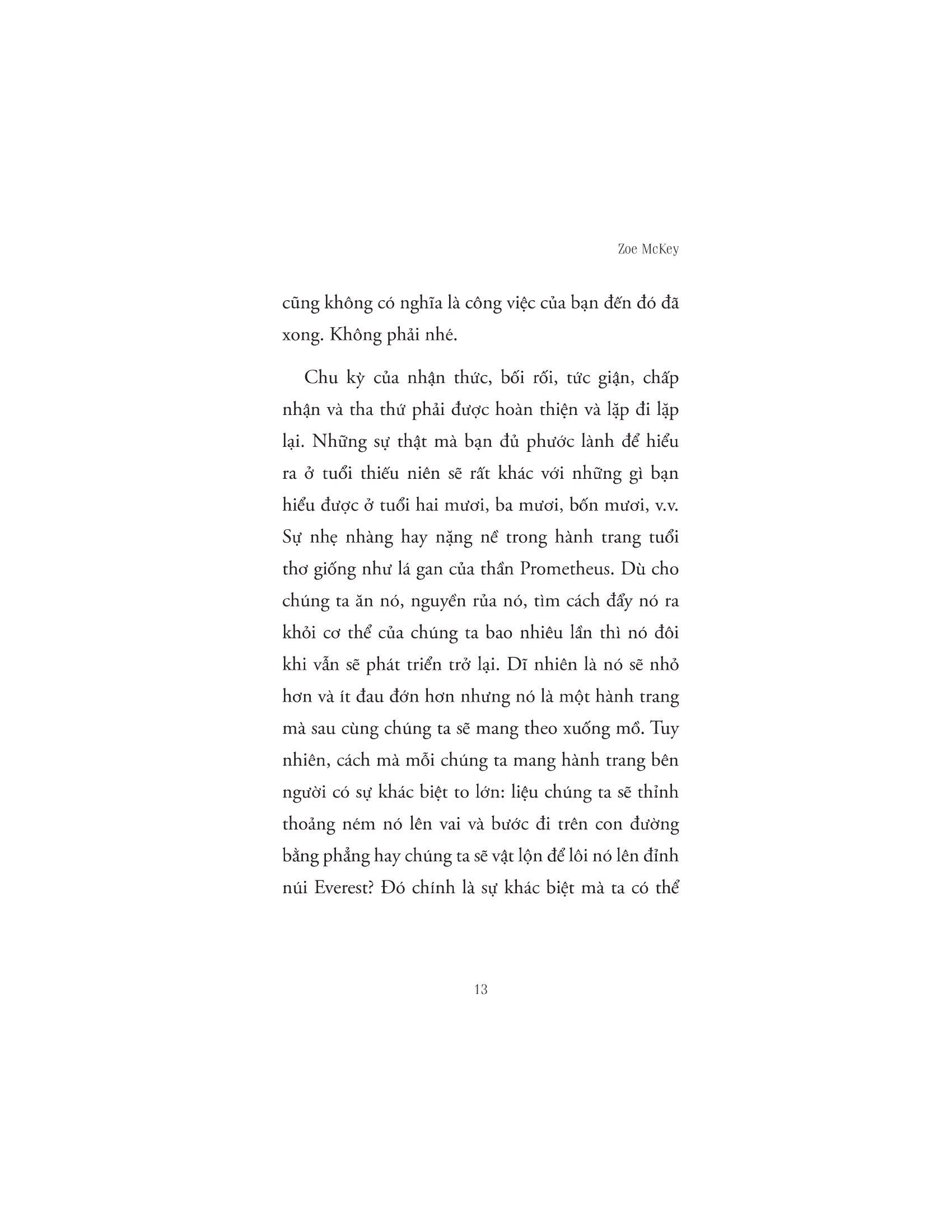 Lắng Nghe Đứa Trẻ Bên Trong Thấu hiểu cảm xúc để yêu thương, chữa lành tổn thương để hạnh phúc Sự trưởng thành không phải là một điểm đến mà là một hành trình. Hành trình khám phá bản thân, nhìn nhận những gì bạn làm và cảm nhận. Sự trưởng thành là quá trình bạn tìm kiếm ý nghĩa cho cuộc sống của m.ình những giá trị và mục tiêu quan trọng. Bạn biết cách cân bằng giữa công việc và cuộc sống, giữa việc chăm sóc bản thân và quan tâm đến người khác. Bạn biết cách yêu thương và được yêu thương. Từ đó có thể tạo ra những mối quan hệ chân thành và bền vững. Tuy vậy, trưởng thành luôn đi kèm những đánh đổi và tổn thương, cho dù chúng ta đã cố gắng phớt lờ hay lãng quên thì đứa trẻ ở nơi sâu thẳm tâm hồn vẫn sẽ ghi nhớ kĩ lưỡng từng chút một. Và những tổn thương ấy đều không có vết sẹo nào chảy máu cả. Dẫu vậy nó vẫn đề lại trong tâm trí mỗi người một nét vẽ nghệch ngoạc. Cuốn sách “Lắng nghe đứa trẻ bên trong bạn” sẽ giúp bạn thấu hiểu cảm xúc, quay về với chính m.ình để yêu thương và chữa lành. Cuốn sách nhấn mạnh giá trị thực sự của bản thân bạn, học hỏi những kỹ năng để trở nên tự tin, cải thiện các mối quan hệ và cởi bỏ sự non nớt về mặc cảm xúc. Cuộc đời này là của bạn, vì thế đừng cầm bản đồ của người khác để dò đường đi của m.ình. Bạn có quyền quyết định cách bạn muốn sống. Hãy tìm ra sự can đảm của m.ình. Hãy sống một cách đích thực. Hãy bảo vệ bản thân và những gì quan trọng với bạn. Hãy phá kén, tỏa sáng theo cách riêng của m.ình. Khi chúng ta hành động dựa trên tiền đề của nhận thức và hành động dựa trên những giá trị tốt nhất của bản thân mình (thay vì nỗi sợ hãi, lo lắng và thiếu sót), chúng ta sẽ làm chủ vận mệnh của mình. Bởi chúng ta có quyền kiểm soát nó. Về tác giả: Zoe McKey là tác giả bán chạy nhất trên Amazon cũng đồng thời là một nhà khai vấn giao tiếp, lối sống. Cô được hàng triệu độc giả săn đón nhờ những tư duy và nghệ thuật giao tiếp, bí quyết phát triển bản thân tuyệt vời đã được cô chia sẻ thông qua những cuốn sách của m.ình và qua blog cá nhân. Trong thời gian vài năm trở lại đây, Zoe McKey bắt đầu viết lách, tập trung cho tình yêu cuộc sống và chia sẻ nó lại qua những cuốn sách. Những diễn giải của Zoe McKey trong sách sẽ giúp bạn đọc tìm ra được lý do để họ sống theo cách của riêng m.ình, luôn có một lời giải thích cho hành vi của bạn mà chính bạn cũng không nhận ra. Đọc sách Zoe McKey sẽ giúp bạn khai phá trí óc và hành động theo một cách mới để không ngừng tốt hơn trong cuộc sống.