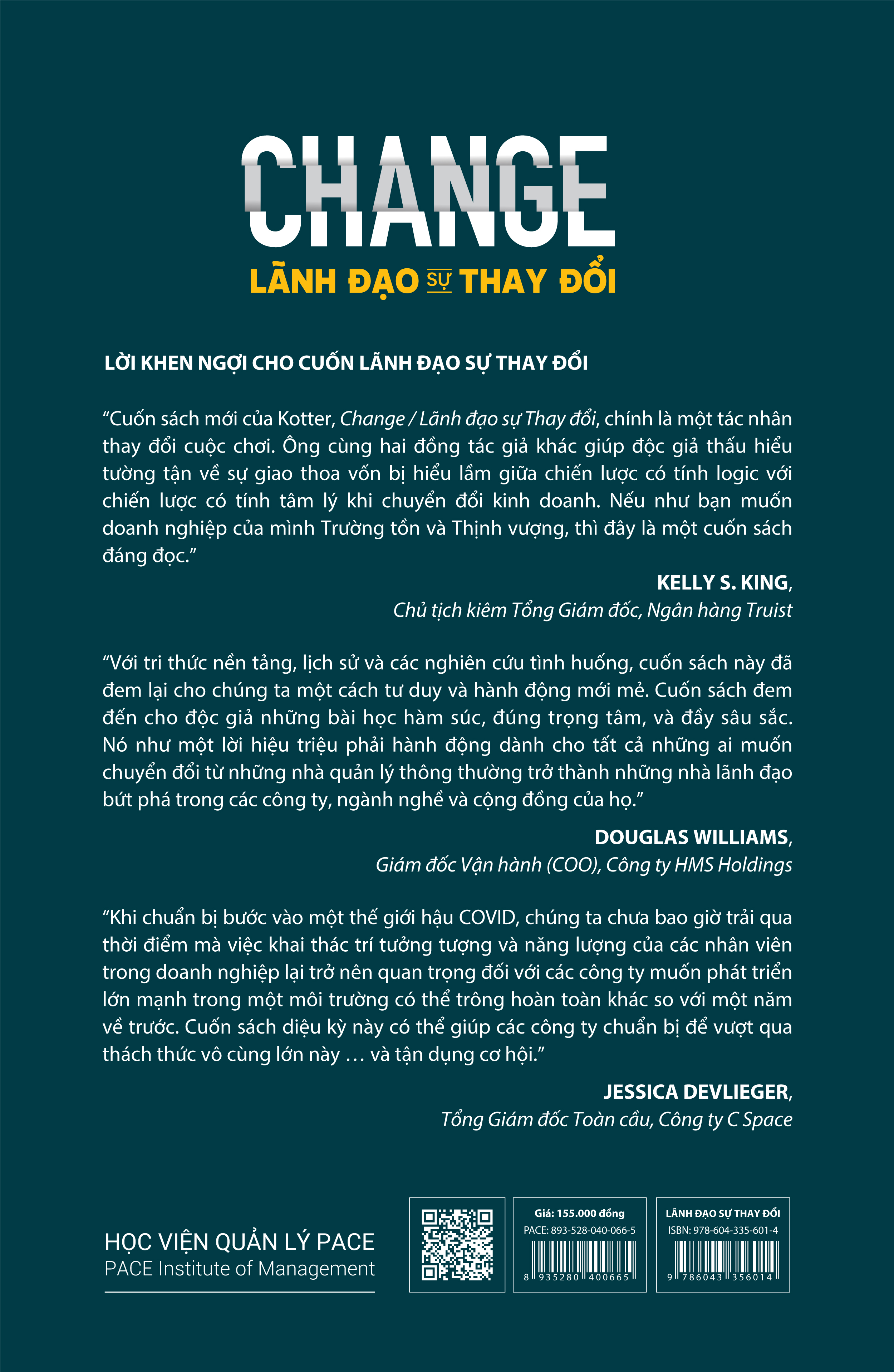 Cuốn Change / Lãnh đạo sự thay đổi (tác phẩm mới nhất của tác giả kinh điển John Kotter) với nguồn gốc từ những kinh nghiệm chuyên sâu của ông về khoa học thần kinh, các nghiên cứu về tổ chức, lịch sử kinh doanh, khả năng lãnh đạo, nghiên cứu về văn hóa doanh nghiệp,… sẽ dẫn dắt bạn tạo ra những thay đổi có tính bứt phá.