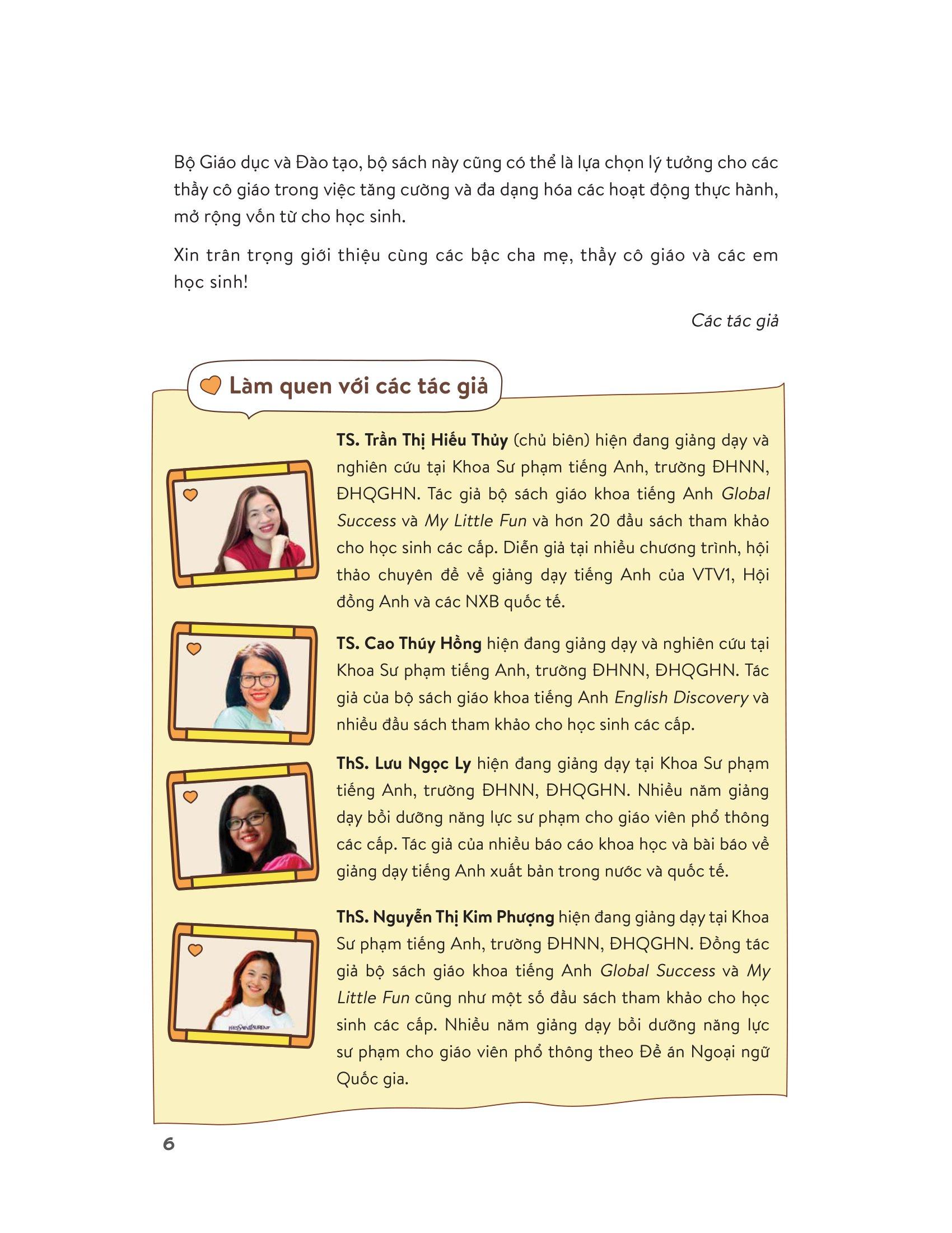 Ngoài ra, bộ sách cũng có sự tham gia đóng góp của các tác giả như: TS Cao Thúy Hồng, Ths Lưu Ngọc Ly, Ths Nguyễn Thị Kim Phượng, Ths Nguyễn Thị Diệu Hà. Họ đều là những giảng viên có nhiều năm nghiên cứu và giảng dạy tiếng Anh, là tác giả của nhiều bộ sách tiếng Anh, đồng thời cũng tham gia đào tạo, bồi dưỡng cho giáo viên tiếng Anh các cấp theo các chương trình của Bộ GD&ĐT.