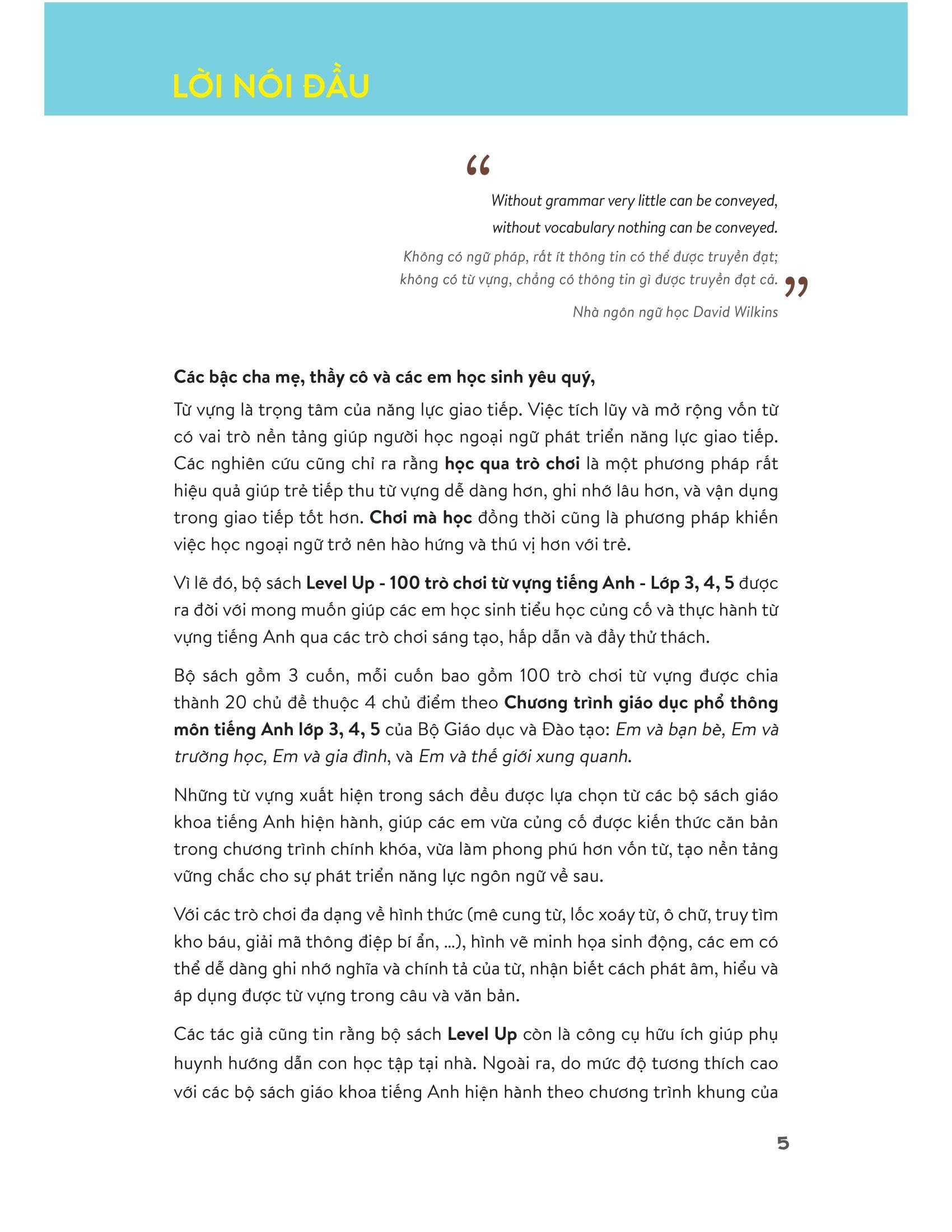 Level Up – 100 trò chơi từ vựng tiếng Anh (Lớp 3-4-5) là bộ sách học từ vựng qua trò chơi dành cho học sinh tiểu học các lớp 3, 4 và 5. Mỗi cuốn sách bao gồm 100 trò chơi cực vui và thú vị nhằm giúp học sinh ôn luyện, ghi nhớ và biết cách sử dụng các từ vựng cơ bản theo chương trình sách giáo khoa của Bộ GD&ĐT.