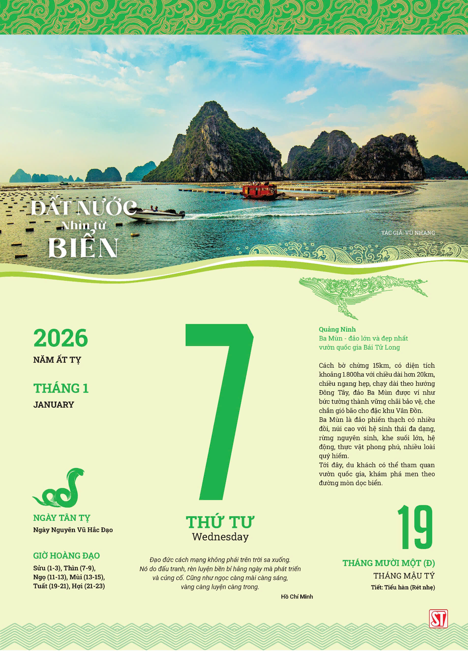 Mỗi trang lịch là một câu chuyện về ý chí và niềm tin. Đó không chỉ là vẻ đẹp mê hồn của biển xanh, cát trắng – mà còn là hình ảnh của những ngư dân kiên cường giữa trùng khơi, của những chiến sĩ ngày đêm canh giữ biển đảo, và của cả một dân tộc biết vượt lên thử thách, vươn ra sóng lớn bằng đôi tay và trái tim bền bỉ. Trên nền ảnh in giấy mỹ thuật cao cấp, từng khung cảnh – từ Hạ Long đến Trường Sa – như thấm đẫm hơi thở của đất nước đang chuyển mình mạnh mẽ, vừa giữ gìn di sản thiên nhiên, vừa chinh phục những chân trời mới của phát triển.
