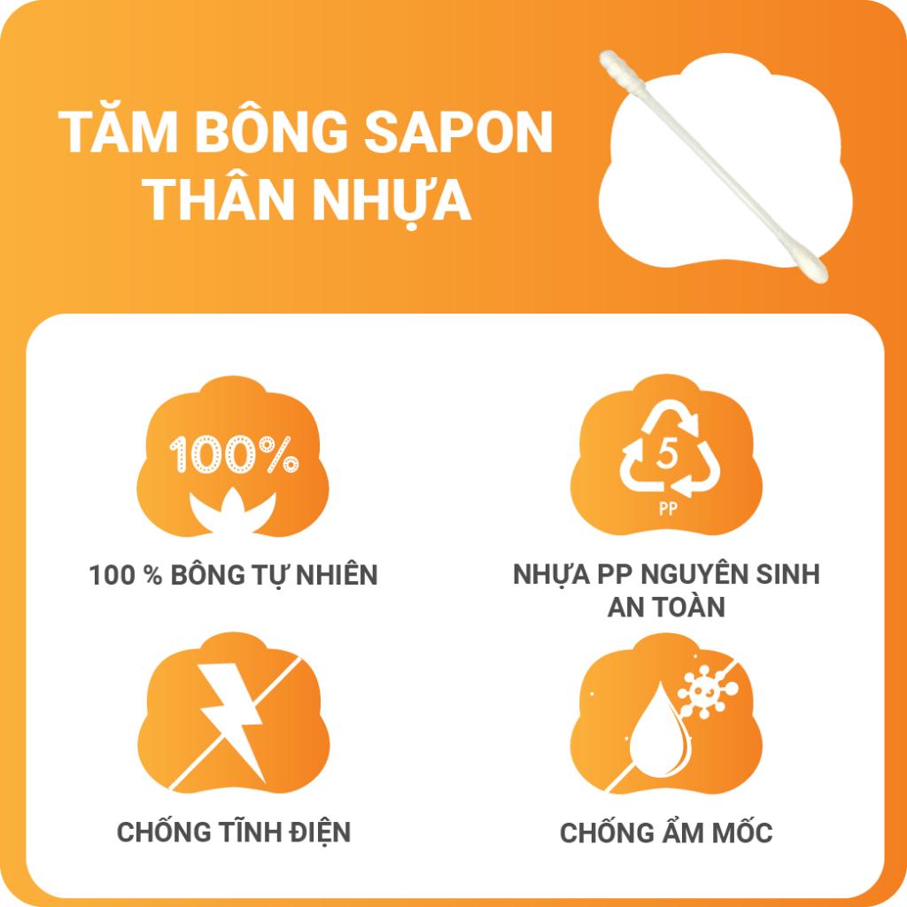 Mua tại Tiktok- ĐẶC ĐIỂM SẢN PHẨM 1.1. Tiệt trùng bằng công nghệ sốc nhiệt tự động, kháng khuẩn vượt trội Toàn bộ phần bông và thân que của Tăm bông Yumy được tiệt trùng bằng công nghệ sốc nhiệt tự động nhập khẩu từ Thụy Sĩ, mang lại khả năng kháng khuẩn vượt trội, an toàn khi sử dụng. 1.2. 100% bông cotton thuần tự nhiên, mềm mại, thấm hút nhanh Phần đầu bông được sản xuất từ nguyên liệu 100% bông cotton, cho khả năng thấm hút tối ưu. Sản phẩm thấm hút nhanh chóng chất lỏng, dịch bẩn trong quá trình vệ sinh cá nhân hay vệ sinh vật dụng, giúp bề mặt cần vệ sinh được khô ráo, ngăn ngừa nấm mốc và vi khuẩn phát triển. 1.3. Dây chuyền sản xuất hàng đầu thế giới, nhập khẩu từ Thụy Sĩ Đây là dây chuyền tiên tiến bậc nhất hiện nay trong lĩnh vực sản xuất tăm bông. Sản phẩm làm ra có chất lượng cao và đồng đều. Toàn bộ quá trình sản xuất được thực hiện khép kín, đảm bảo vệ sinh và độ an toàn cho sản phẩm. 1.4. Tích hợp thông minh với 2 kiểu đầu bông trong 1 sản phẩm Tăm bông Yumy được thiết kế thông minh với 2 đầu bông khác biệt: 1 đầu hình tròn, 1 đầu dạng xoắn. Đầu bông tròn có tác dụng thấm hút nhanh. Đầu bông còn lại có dạng xoắn với các rãnh nhỏ, rất hiệu quả trong việc tiếp xúc và giữ chặt chất bẩn vào bông, mang lại hiệu quả vệ sinh tối ưu. 1.5. Thiết kế an toàn khi sử dụng