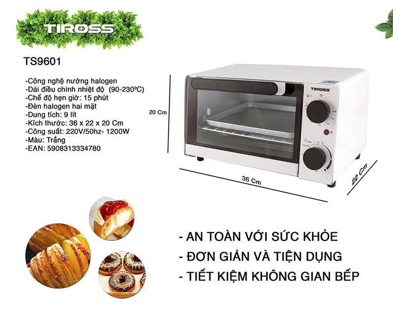 Thông tin sản phẩm Đặc điểm nổi bật của lò nướng Tiross TS9608 28 lít Về thiết kế Lò nướng điện trang bị màn hình LCD với cửa mở ở 3 cấp độ. Chân đế lò vững chắc, tránh ăn mòn. 2 bên lò có khe tản nhiệt giúp lò bền bỉ hơn.  Dung tích 28 lít Với dung tích 28 lít, lò nướng Tiross TS9608 có thể nướng được 6 lát bánh mì và 1 chiếc pizza đường kính 30cm. Tiện ích Chế độ kiểm soát nhiệt điện trở, dễ dàng điều chỉnh nhiệt độ từ 66 - 232 độ C.  Lò có chức năng hẹn giờ 60 phút và có chuông báo khi kết thúc. Về thanh nhiệt Thanh nhiệt trên dưới giúp nhiệt tản đều, nướng thực phẩm thêm ngon hơn.  Thanh nhiệt làm từ kim loại, nhiệt nướng cao, giảm mỡ chất béo, ăn tốt cho sức khỏe.  Lò thiết kế 2 vị trí giá nướng, tự chọn theo ý thích. Người dùng có thể nướng 1 mặt hoặc nhiều mặt. Người dùng có thể nướng bằng khay và nướng bằng giá đồng thời sử dụng.  Dễ sử dụng Lò nướng Tiross thiết kế bảng điều khiển dạng nút nhấn và 2 núm vặn cơ: - Nút bắt đầu/tạm dừng - Nút quay - Nút đối lưu - Núm chọn chức năng - Nút cài đặt hẹn giờ/nhiệt độ