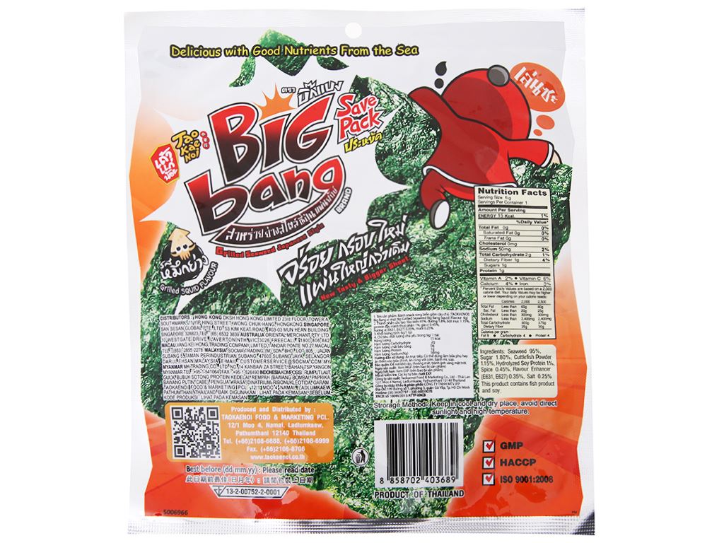 Mua tại TiktokSnack rong biển Big Bang vị mực của Tao Kae Noi là món khoái khẩu khi dùng chung với các loại thức nhấm như bia hoặc rượu trong những dịp gặp gỡ vui chơi hay