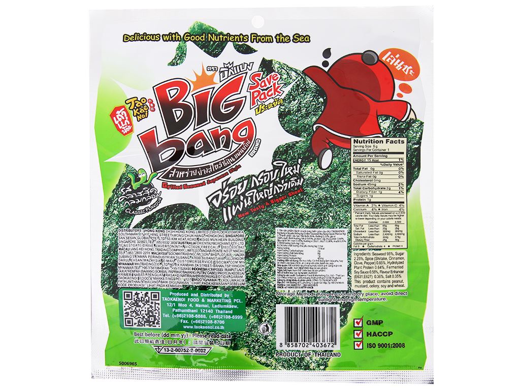 Mua tại TiktokRong Biển Taokaenoi Big Bang Vị Truyền Thống được làm từ rong biển tươi ngon, tốt cho sức khỏe. Sản phẩm sử dụng phương pháp sấy chân không nên rong biển vẫn giữ được đặc tính tự nhiên với hơn 90 loại khoáng chất và hàm lượng muối thấp, canxi cao. Thành phần: Tảo biển 95%, đường 2.25%, gia vị (nấm, quế, đinh hương, tiêu) 0.85%, protein cây thủy phân 0.64%, đậu nành lên men 0.55%, hương vị (E631, E627) 0.36%, muối 0.35% Dùng trực tiếp. Bảo quản nơi khô ráo, thoáng má