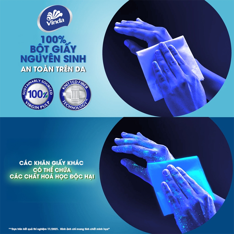 Câu chuyện thương hiệu:   Các gia đình Việt Nam đang ngày càng quan tâm sâu sắc hơn về các giải pháp chất lượng và an toàn dành cho toàn bộ mọi người trong gia đình đặc biệt là trẻ nhỏ. Họ mong muốn sản phẩm không chỉ hiệu quả mà còn mang đến chất lượng thoải mái để họ có thể yên tâm về sức khỏe cũng như sự an toàn cho các thành viên trong gia đình. Vinda thấu hiểu sâu sắc và luôn nỗ lực để đáp ứng yêu cầu thích đáng của khách hàng.  Vinda mong muốn trở thành một phần không thể thiếu trong các hoạt động thường nhật của gia đình bạn. Khăn giấy Vinda sẽ mang đến sự hiệu quả cũng giống như sự bền dai vượt trội ngay cả khi ướt thông qua công nghệ Knitted Fiber chuyên biệt, qua đó, để các gia đình luôn cảm giác an tâm và thoải mái trong mọi khoảnh khắc.   Giới thiệu sản phẩm: Khăn giấy rút Vinda được làm từ bột giấy nguyên chất, không chứa hóa chất tẩy trắng độc hại, an toàn cho sức khỏe người dùng. Sản phẩm Vinda bền dai ngay cả khi ướt, không để lại vụn giấy khi sử dụng Thiết kế dạng rút tiện lợi giúp lấy giấy dễ dàng, hợp vệ sinh, phù hợp sử dụng trong gia đình, văn phòng, nhà hàng, trường học hoặc mang theo khi di chuyển. Phù hợp lý tưởng để vệ sinh cá nhân như lau tay, lau mặt, hoặc vệ sinh vật dụng cá nhân, bàn ăn hay các bề mặt khác. Ngoài ra, sản phẩm cũng thích hợp dùng trong các bữa ăn, đảm bảo an toàn thực phẩm và mang lại cảm giác sạch sẽ, dễ chịu.   Hạn sử dụng và quy cách: Hạn sử dụng: 3 năm kể từ ngày sản xuất. Ngày sản xuất: in trên gói theo năm/tháng/ngày   Quy cách:  Khăn giấy rút cao cấp Vinda Deluxe Size L Số lượng: 110 tờ 1 gói Số lớp: 3 lớp/ tờ Định lượng của 1 lớp giấy: 14 ± 1,0 gsm Kích thước: (189mm x 195mm) ± 5 mm Thành phần: 100% Bột giấy nguyên thủy. Bảo quản: Để nơi thoáng mát và tránh ánh nắng mặt trời