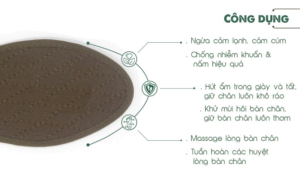CÔNG DỤNG CỦA LÓT GIÀY QUẾ VẢI COTTON CI-03 Được làm từ nguyên liệu Quế Trà My nên có rất nhiều công dụng như: - Diệt nấm, vi khuẩn tồn tại trong giày.