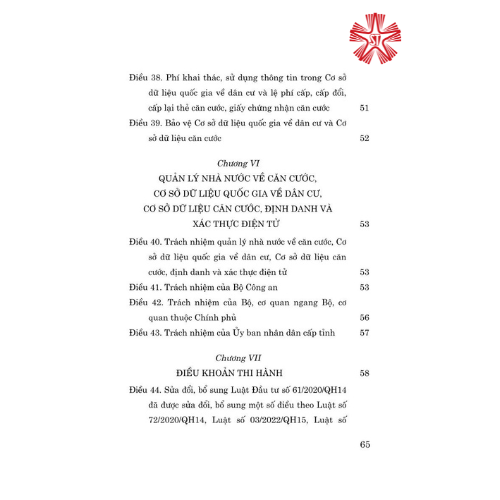 Luật Căn cước năm 2023 được Quốc hội khóa XV, kỳ họp thứ 6, thông qua ngày 27/11/2023, gồm 07 chương, 46 điều, quy định về: cơ sở dữ liệu quốc gia về dân cư, cơ sở dữ liệu căn cước; thẻ căn cước, căn cước điện tử; giấy chứng nhận căn cước; quyền, nghĩa vụ, trách nhiệm của cơ quan, tổ chức, cá nhân có liên quan. Luật có hiệu lực thi hành từ ngày 01/7/2024, trừ trường hợp quy định tại khoản 3 Điều 46.
