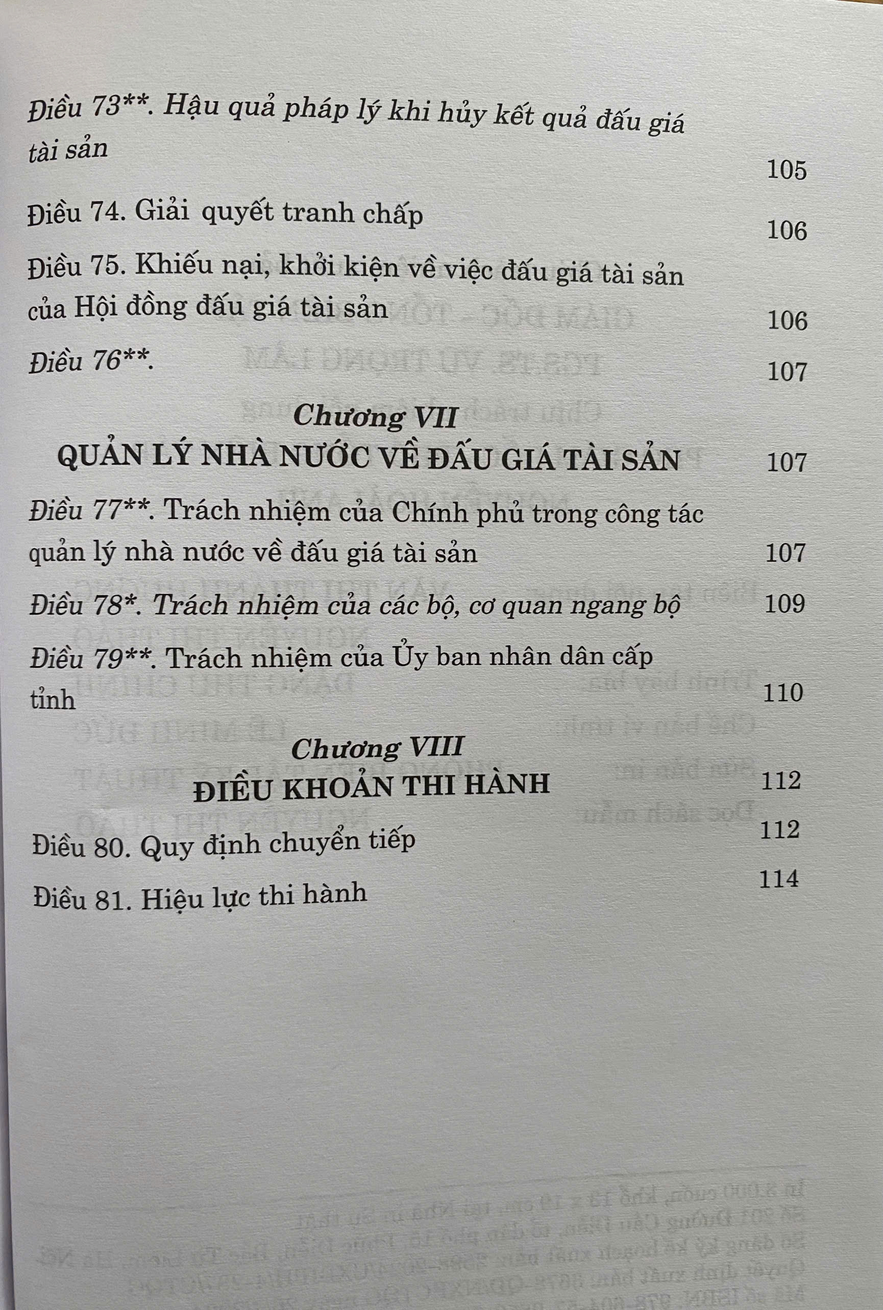 Luật Đấu giá tài sản (hiện hành) gồm 8 chương, 81 điều, quy định về nguyên tắc, trình tự, thủ tục đấu giá tài sản; đấu giá viên, tổ chức đấu giá tài