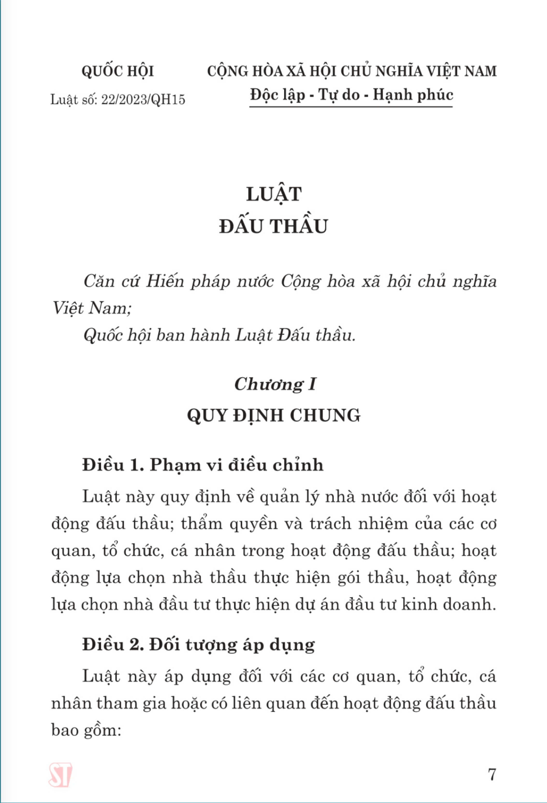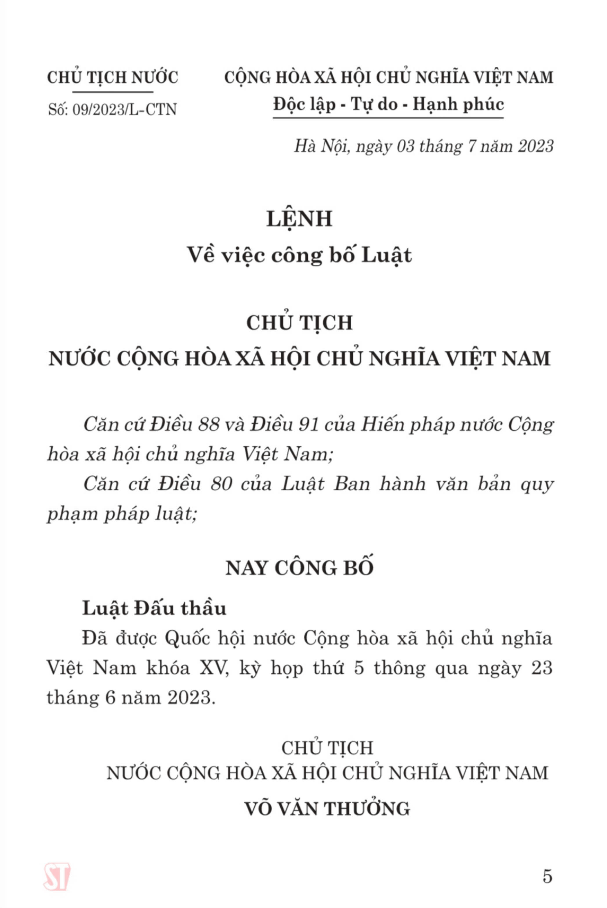Cǎn cứ Điều 88 và Điều 91 của Hiến pháp nước Cộng hòa xã hôi chủ nghĩa Việt Nam; Căn cứ Điều 80 của Luật Ban hành vǎn ban quy phạm pháp luật; Nay công bố Luật Đấu thầu Đã được Quốc hội nước Cộng hòa xã hôi chủ nghĩa Viêt Nam khóa XV, kỳ họp thứ 5 thông qua ngày 23 tháng 6 nǎm 2023.