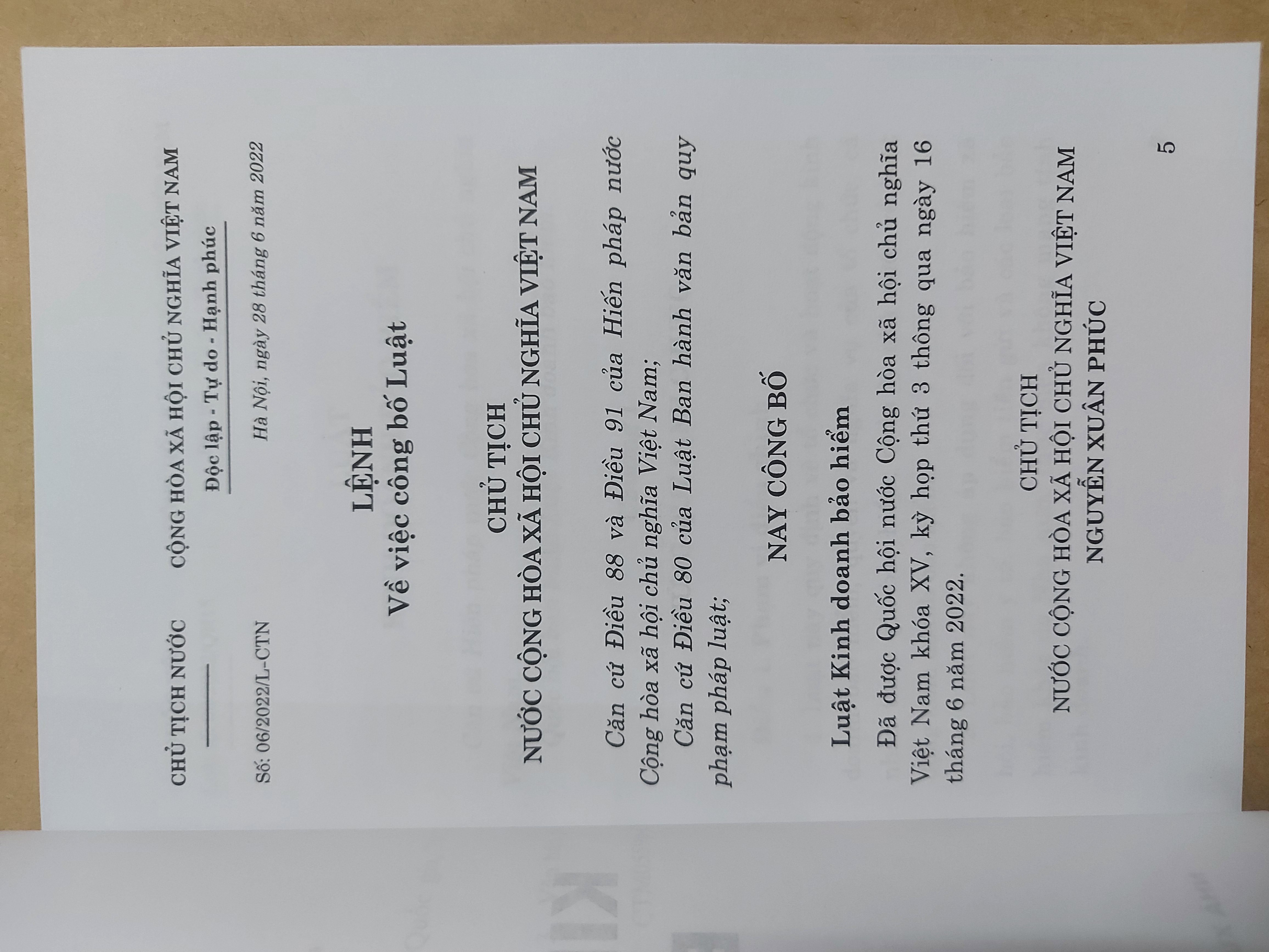 Luật Kinh Doanh Bảo Hiểm số 08/2022/Qh15 đã được Quốc Hội thông qua ngày 16 tháng 6 năm 2022 (  Luật này có hiệu lực từ ngày 01 -01 -2023)
