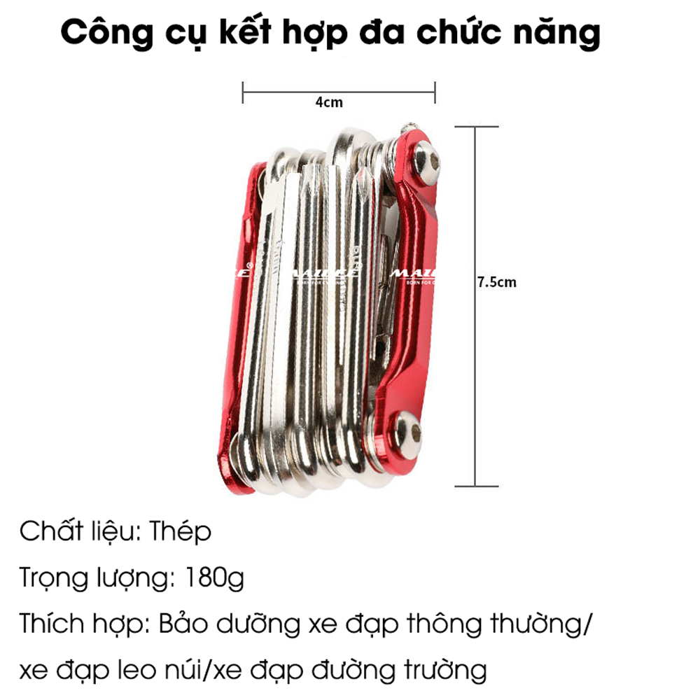 Lục giác sửa chữa xe đạp 11 trong 1, bao gồm các dụng cụ đủ loại như đinh vít, lục giác, cắt xích và nạy lốp   Bộ dụng cụ xe đạp này có 11 chức năng trong 1 bộ; Các chìa khóa được làm từ thép chất lượng, đã qua tôi luyện và mạ niken bề mặt; Thanh khung được làm bằng hợp kim nhôm, được anot hóa với các tùy chọn màu đỏ, đen hoặc xanh dương. Đi kèm với dụng cụ cắt xích và các lục giác tua vít khác thường cần thiết trong việc bảo dưỡng xe đạp. Thiết kế nhỏ gọn, tiện lợi khi sử dụng và dễ dàng lưu trữ.         Công cu đa chức năng giúp gia đình sử dụng hoặc sửa chữa nhỏ các chi tiết của xe đạ v. v. Bộ công cụ sửa chữa 7 trong 1 đa chức năng Tua vít 1 cạnh Tua Vít 4 cạnh 2.5 / 3 / 4 / 5 / 6mm Hex (Allen) Lục giác Màu sắc: đỏ, vàng, xanh, bạc Trọng lượng: 98g Kích thước: 8.5x3.4cm