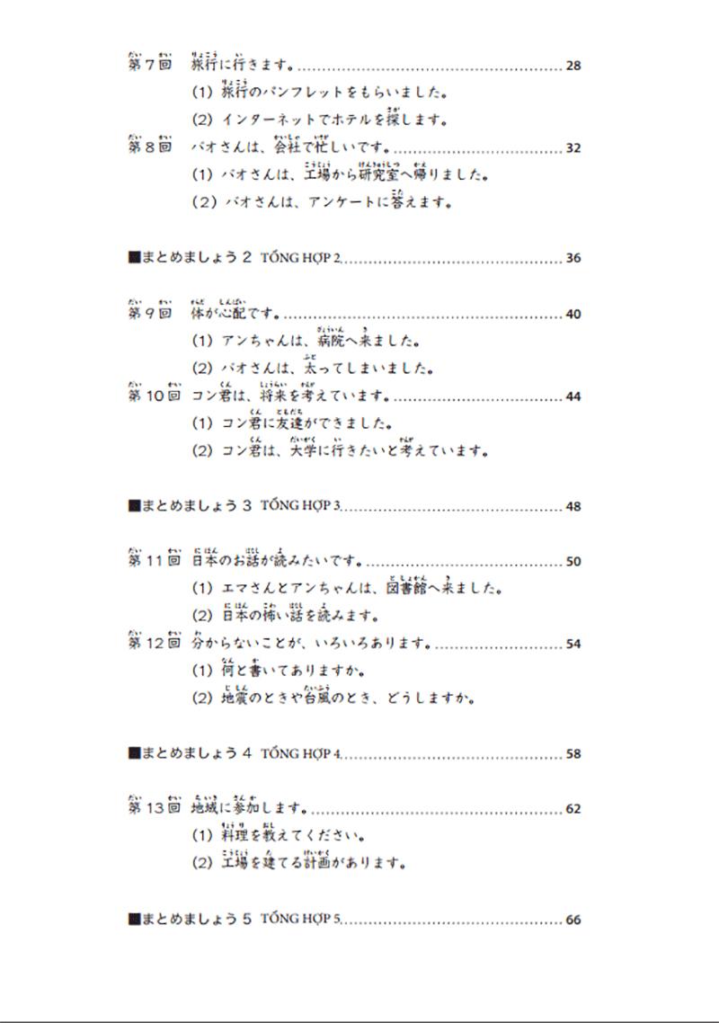 Cuốn sách gồm 15 bài (mỗi bài chia làm 2 phần), 7 bài “Tổng hợp” và 2 bài kiểm tra năng lực. Mỗi bài các bạn sẽ học trong 3-4 ngày, phần Tổng hợp” học trong 2 ngày, như vậy trong khoảng thời gian 3-4 tháng các bạn có thể hoàn thiện được chương trình N4.