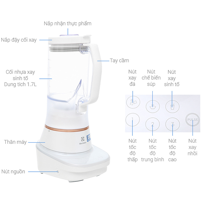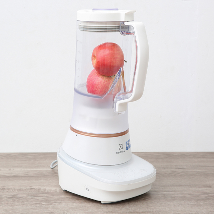 Máy xay sinh tố Electrolux sang trọng trong màu trắng bạc với viền vàng đồng và cối trong suốt, thiết kế hiện đại nổi bật ở mọi góc nhìn Cối xay chất liệu nhựa Tritan cao cấp, trong suốt