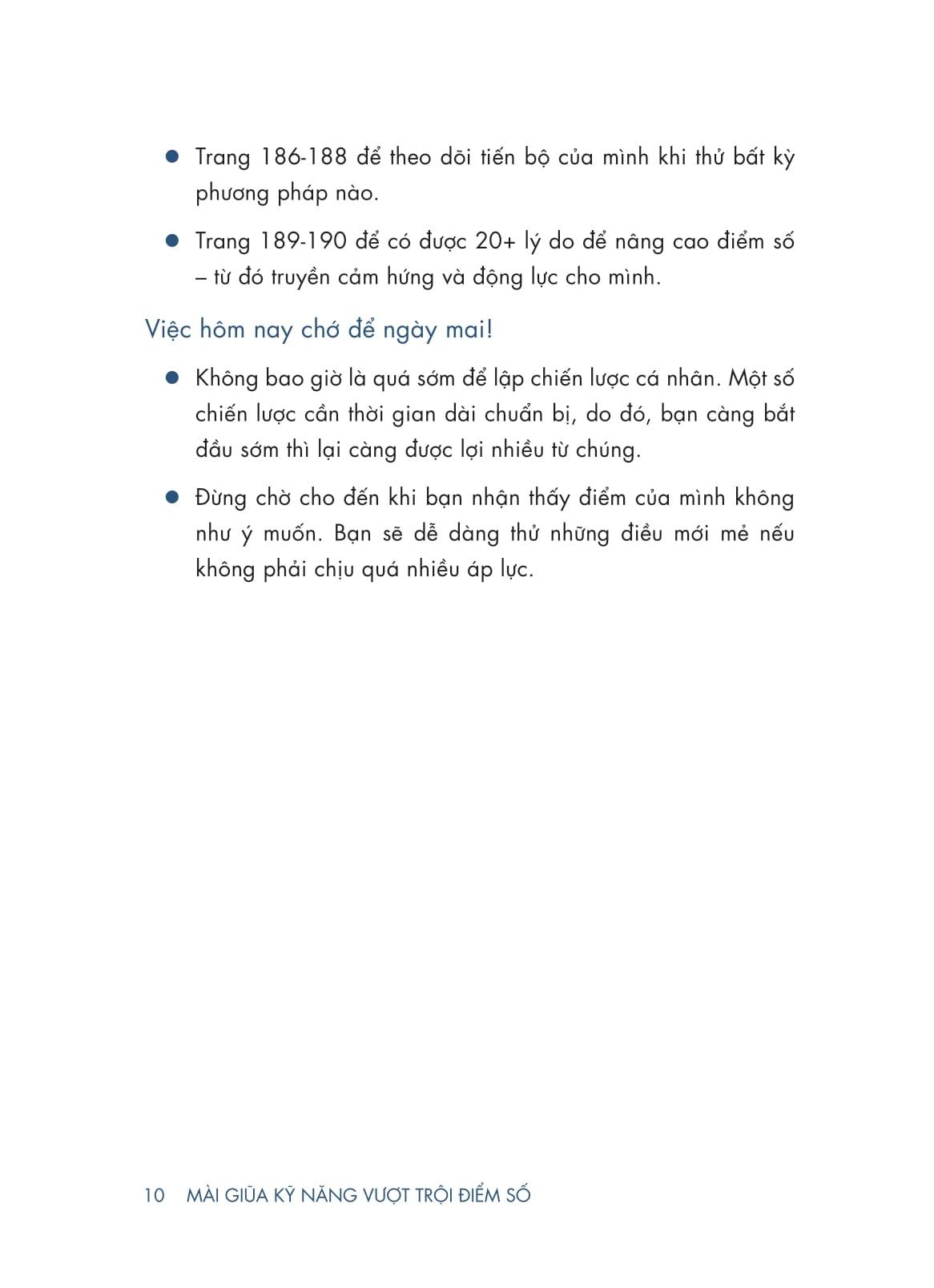 Mài Giũa Kỹ Năng - Vượt Trội Điểm Số “Cùng một cách làm nhưng tại sao mình lại không được đánh giá cao?”, “Tại sao miệt mài học ngày học đêm mà điểm số vẫn lẹt đẹt?”, “Làm thế nào để không uể oải khi nhắc đến việc học?” - đó là những băn khoăn luôn thường trực trong tâm trí, cùng nỗi sợ “không đủ điểm” có thể kéo tinh thần của người học xuống bất cứ lúc nào. MÀI GIŨA KỸ NĂNG – VƯỢT TRỘI ĐIỂM SỐ với 50 mẹo nhỏ linh hoạt mà hữu ích cần có cho các bạn học sinh/sinh viên với các chỉ dẫn chi tiết: tự lên lộ trình học tập cho riêng bản thân; kiểm soát thời gian trong việc ôn tập và các kỳ thi; tinh chỉnh bài làm để đạt thêm điểm cộng; chọn lọc kiến thức một cách chủ động và bồi dưỡng sức khỏe tinh thần. Đây cũng là cuốn sách thứ 3 trong bộ Cẩm nang sinh viên, được viết bởi Stella Cottrell – chuyên gia giáo dục và hướng nghiệp người Anh, tác giả của Lộ trình bạn đi Tương lai bạn chọn và Tháo gỡ căng thẳng Mở lối tiềm năng – những cuốn sách hữu ích nổi tiếng với các bạn trẻ. Hãy “note” lại trong trí óc để nhớ kỹ hơn rằng, chỉ cần một chiến lược phù hợp thì gần như ai cũng đủ khả năng đạt được điểm số tuyệt đối, tiến tới thành công. Và đương nhiên, bạn cũng thế!