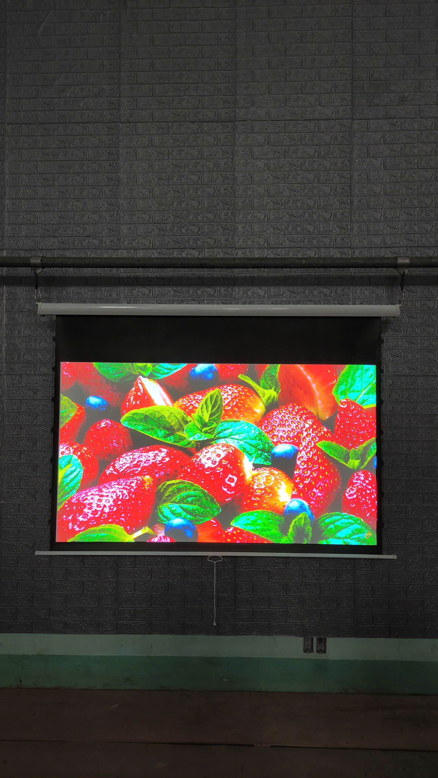 Vỏ màn hợp kim phủ sơn tĩnh điện, chống gỉ – kiểu dáng bo cong tinh tế, phù hợp với mọi không gian: gia đình, văn phòng, lớp học, rạp mini…