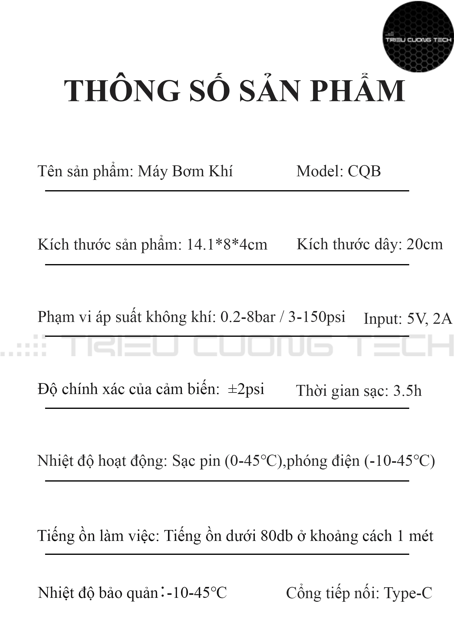 THÔNG SỐ SẢN PHẨM - Model: CQB04 - Kích thước sản phẩm: 14.1*8*4cm - Kích thước dây: 20cm - Dung lượng pin: 2000mAh - Phạm vi áp suất không khí: 0.2-8bar / 3-150psi - Input: