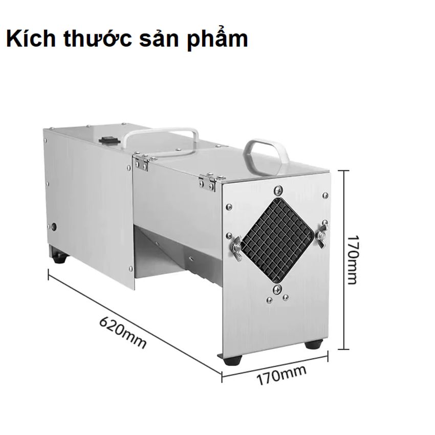 - Máy cắt khoai tây chiên tuy là một thiết bị tự động nhưng máy có thiết kế nhỏ gọn, kích thước 620 x 170 x 170mm, có thể di chuyển hoặc đặt cố định ở mọi vị trí mà không tốn diện tích - Thân máy được làm bằng vật liệu inox 304 sáng bóng, khả năng chống han gỉ cao giúp hạn chế những tác động của ngoại cảnh và môi trường bếp nấu. Đặc biệt chất liệu inox cao cấp, không làm ảnh hưởng đến màu sắc và mùi vị của nguyên liệu, đảm bảo vệ sinh an toàn thực phẩm Vệ sinh máy dễ dàng, đảm bảo an toàn vệ sinh thực phẩm