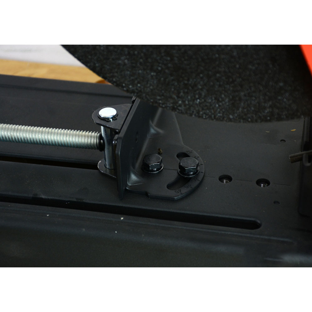 Máy cắt sắt có điều chỉnh góc cắt trong phạm vi 0 - 45 độ. Để điều chỉnh góc theo yêu cầu, chỉ cần nới lỏng các đinh ốc hãm 13 của cữ chặn góc bằng khóa đầu lục giác đi kèm 14 (8mm). Sau đó điều chỉnh góc muốn có và siết chặt cả hai vít khóa 13 lại như trước.