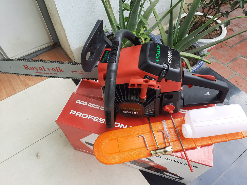 Sản phẩm bao gồm: Thân máy, tay cầm, Lam 55 cm, Xích cưa, Hộp đựng lam xích, Lọ đổ dầu, Ốc vít và phụ kiện mở ốc, Phiếu bảo hành máy cưa.