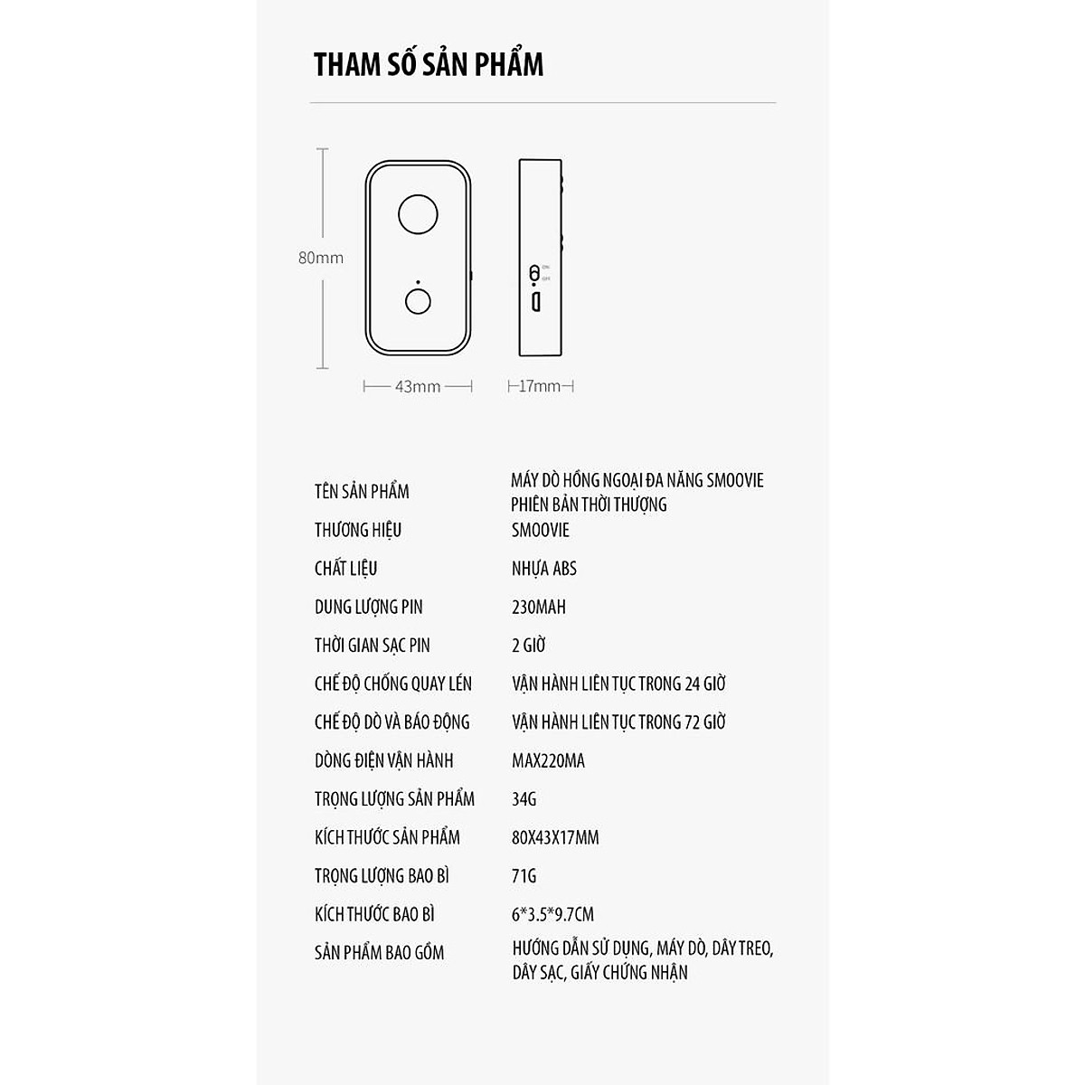 Được trang bị pin lithium 230mAh, hỗ trợ sạc USB và loại bỏ những rắc rối của việc thay pin thường xuyên. Thời lượng pin lâu, sạc 1 lần, chế độ chống quay lén có thể sử dụng liên tục trong 24 giờ, chế độ phát hiện báo động có thể sử dụng liên tục trong 72 giờ.