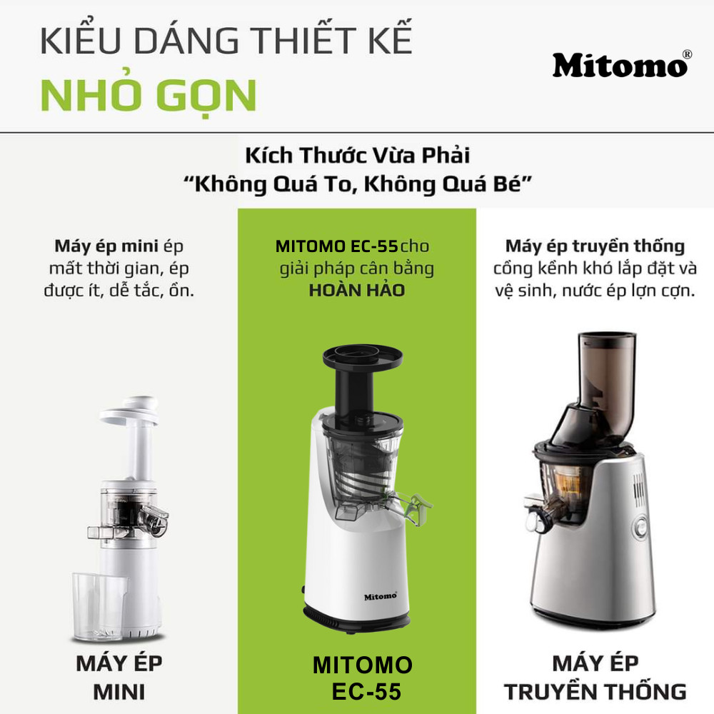 Máy ép trái ép chậm Mitomo EC-55 giúp ép siêu kiệt bã đến 95%, với thiết kế kiểu dáng máy ép trái cây vô cùng tiện dụng sang trọng và tinh tế. Máy ép chậm theo cơ chế hoàn toàn tự động, trái cây sẽ được ép chậm theo cơ chế xoắn ốc giúp ép trái cây kiệt nước tối đa lên đến 95%. Máy ép nhỏ gọn tháo lắp và vệ sinh vô cùng dễ dàng. Ngoài ra máy hoạt động rất bền bỉ và ép được các loại trái cây cứng.
