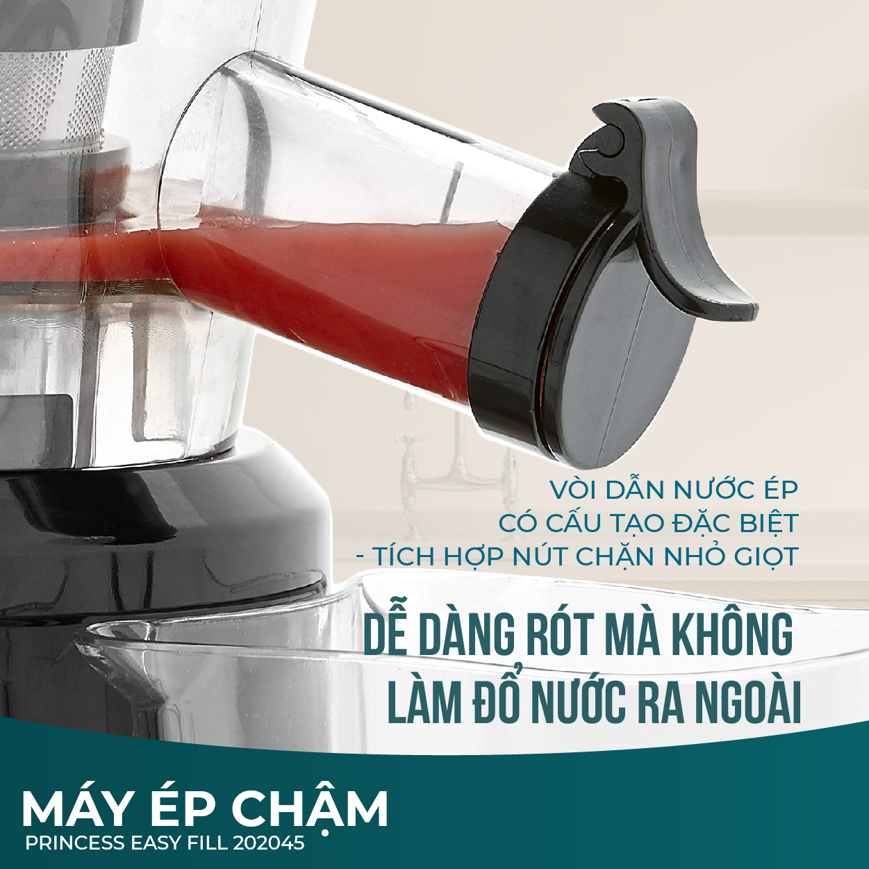 Sử dụng máy ép chậm Princess Easy Fill 202045, bạn có thể ép kiệt 99% lượng nước trong thực phẩm, lưu giữ 99% vitamin và khoáng chất, vượt trội hoàn toàn so với các loại máy ép khác trên thị trường