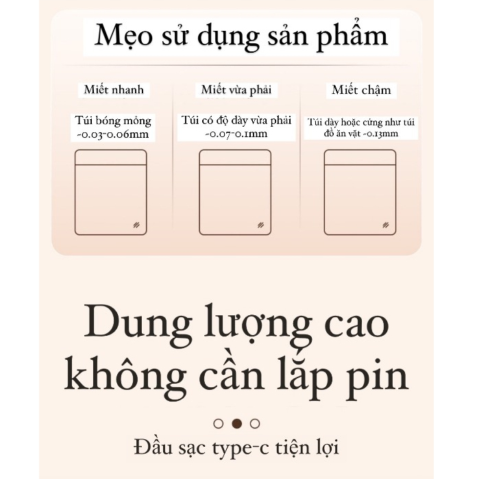 không kén túi không cần chờ làm nóng Tự động hàn và ngắt theo thiết lập thời gian Thân vỏ hợp kim nhôm (bền và tản nhiệt tốt hơn) Bảo hành 12 tháng Thông số