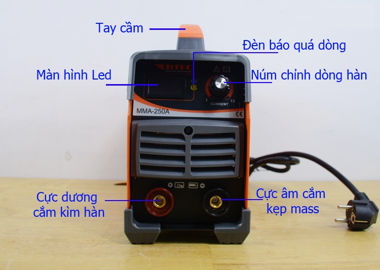 Máy hàn BTEC MMA 250A làm việc hiệu quả với que hàn từ 3.2mm - 4mm Máy hàn BTEC MMA 250A có cường độ dòng hàn tùy chỉnh tới 250A nên thích hợp sử dụng