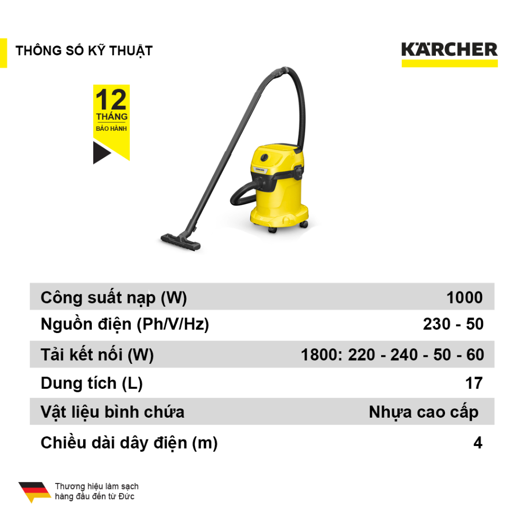 - Máy WD 3 V Car là một máy hút bụi đa năng (máy hút bụi khô & ướt) mới cải tiến cho dòng máy hút bụi đa năng WD 3 car với điện năng tiêu thụ chỉ 1.000 watt. Mặc dù lượng tiêu thụ thấp, thiết bị này mạnh mẽ như một máy hút bụi 1200-watt. Máy hút bụi Karcher giúp cho việc vệ sinh nhà cửa, vệ sinh sân vườn, gara ô tô, nhà xe, xưởng nhỏ ...làm sạch hiệu quả và làm sạch toàn diện hơn.