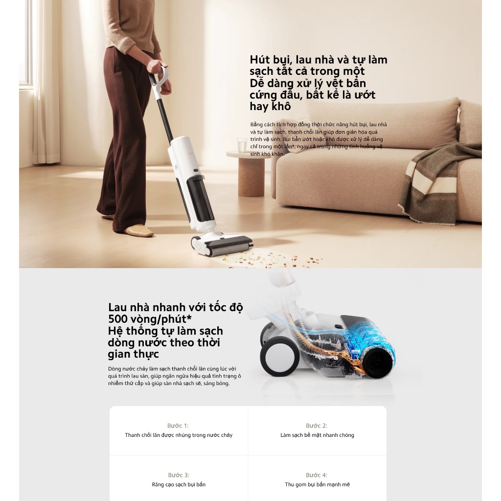 Máy hút bụi lau sàn đa năng Xiaomi Truclean W20 Wet Dry Vacuum - Làm sạch toàn diện, dễ dàng hơn bao giờ hết Hút bụi & lau sàn 3 trong 1 – Dọn dẹp hiệu quả chỉ trong một lần thao tác. Máy kết hợp giữa chức năng hút bụi mạnh mẽ và lau sàn vượt trội, giúp loại bỏ cả bụi khô và vết bẩn ướt chỉ trong một lần di chuyển. Giờ đây, việc dọn dẹp trở nên nhanh chóng, tiết kiệm thời gian nhưng vẫn đảm bảo sạch sâu. Lực hút siêu mạnh 15.000Pa Lau sàn tốc độ cao 500 vòng/phút Tự động tiến tới Pin dung lượng cao 2.500mAh Bình chứa nước lớn – Dọn dẹp thoải mái, không cần thay nước thường xuyên Bình nước sạch: 780ml – cung cấp nước liên tục để làm sạch hiệu quả. Bình nước bẩn: 550ml – chứa được nhiều nước bẩn hơn, giảm số lần phải đổ nước. Tự làm sạch bàn chải lăn Máy hút bụi lau sàn đa năng Xiaomi Truclean W20 Wet Dry Vacuum - Làm sạch toàn diện, dễ dàng hơn bao giờ hết