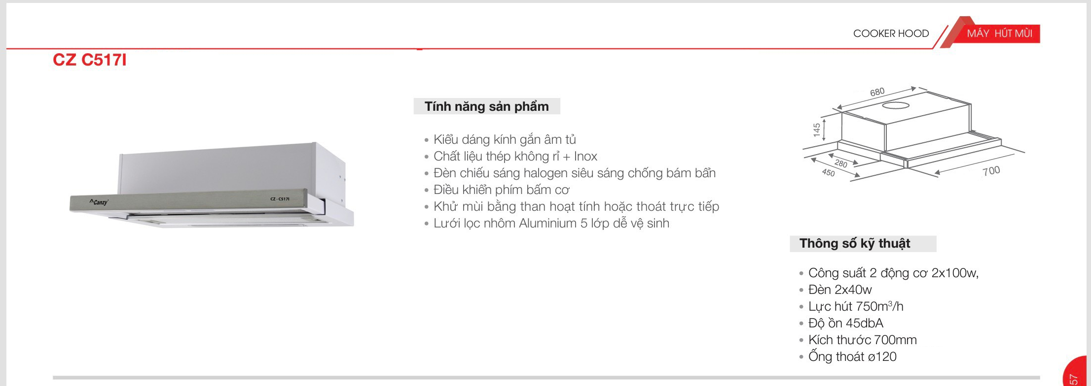 - Chế độ hút đẩy ra ngoài hoặc khử mùi bằng than hoạt tính Thông số kỹ thuật của Máy hút mùi Canzy CZ-C517I