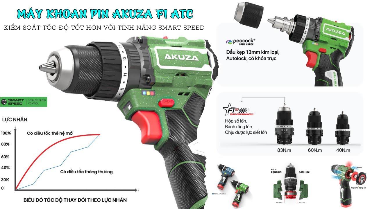 Máy khoan pin Akuza F1 ATC Trang bị tốc độ không tải lên đến 2000 vòng/phút. Bật tắt tính năng chống vặn cổ tay