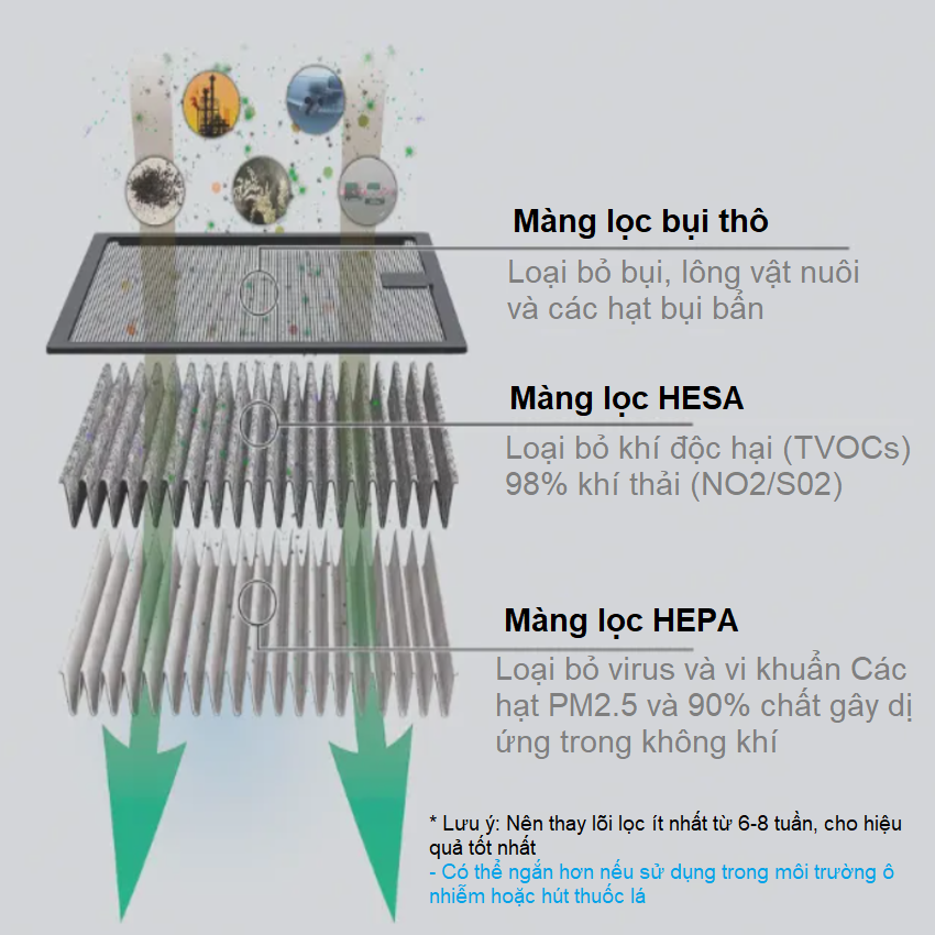 • Màng Lọc Không Khí là lõi lọc thay thế của máy lọc không khí Michelin Ml-19 • Cấu trúc bộ lọc gồm nhiều lớp, thanh lọc nhiều lớp kết hợp với lớp lọc hình