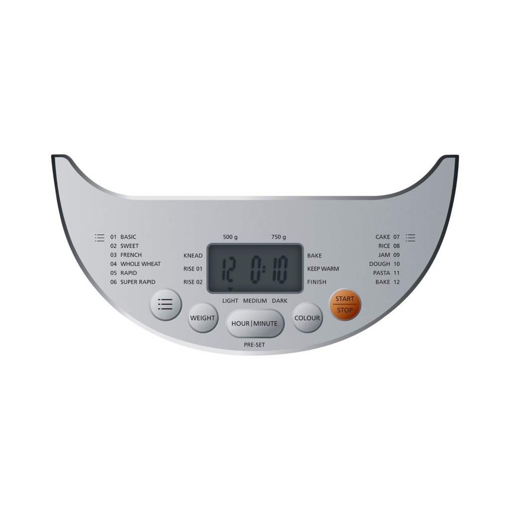 - 12 chương trình mặc định tự động, với chức năng nướng theo trọng lượng (500, 750 g) và mức độ màu nâu của bánh (sáng, trung bình, tối) có thể điều chỉnh