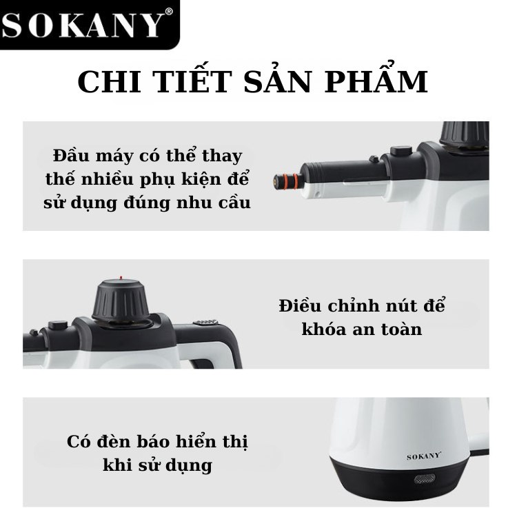 - Với áp suất lớn, máy xịt rửa SOKANY - đi sâu vào các kẽ hở để loại bỏ bụi bẩn bằng hơi nước dễ dàng. LƯU Ý KHI SỬ DỤNG CỦA MÁY LÀM SẠCH BẰNG HƠI NƯỚC SOKANY: Tránh tiếp xúc trực tiếp với hơi nước nóng. Không sử dụng máy trên các bề mặt nhạy cảm với nhiệt: Như gỗ bóng, sơn mới… Tắt máy khi không sử dụng: Để tiết kiệm điện năng và tăng tuổi thọ cho máy. Thường xuyên vệ sinh máy BẢO HÀNH: