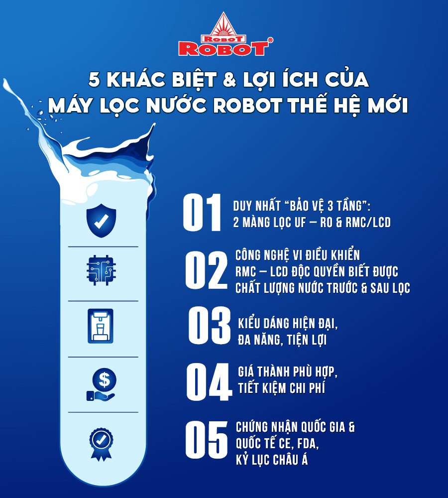 - Máy lọc nước ROBOT ALPHA PRO 9GK-UR thuộc dòng Máy lọc nước thế hệ mới của ROBOT, duy nhất trên thị trường sử dụng công nghệ “Bảo vệ 3 tầng” gồm 2 màng lọc UF + R.O & vi điều khiển RMC/LCD, hỗ trợ người dùng trực tiếp kiểm soát chất lượng nước trước & sau lọc, cảnh báo rủi ro trong quá trình sử dụng.