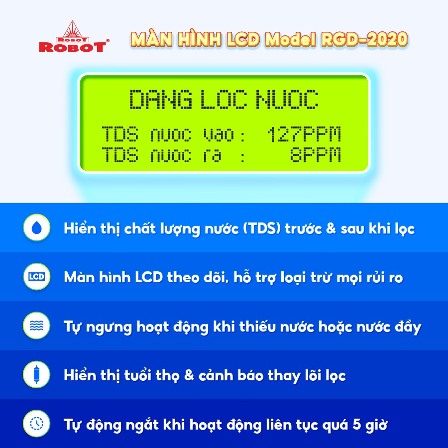 Công nghệ RMC – LCD độc quyền, biết được chất lượng nước trước & sau lọc Bộ vi mạch RMC-LCD thông minh thiết kế phát minh của ROBOT, mọi chi tiết vận hành máy được hiển thị trên màn hình LCD, cảnh báo mọi rủi ro cho người sử dụng Tuổi thọ lõi lọc được tính theo lưu lượng nước sử dụng, không tính theo thời gian ghim điện như các máy thông thường, tiết kiệm tối đa chi phí thay lõi lọc