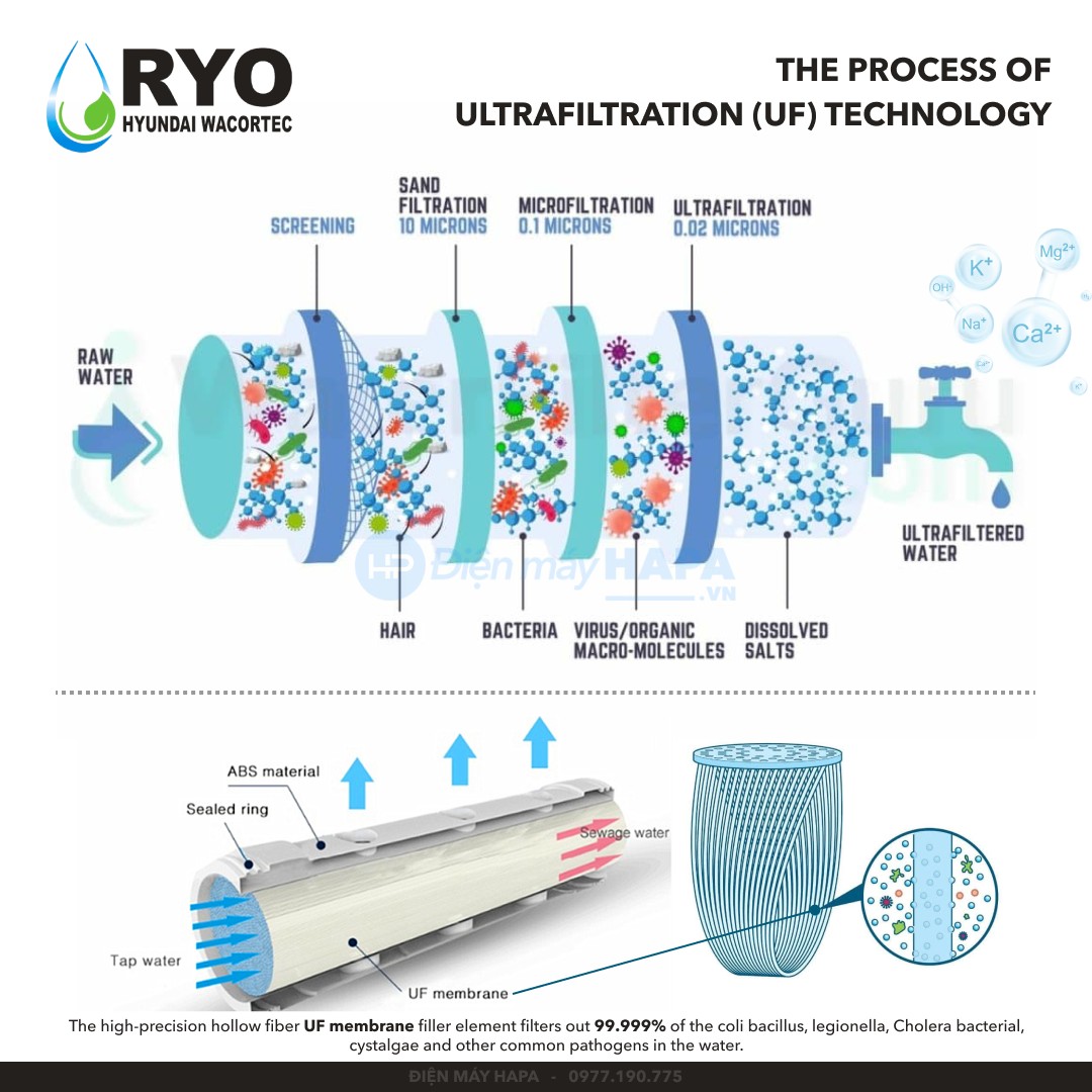 - Tất cả model Lõi Lọc RYO Hyundai có bán đầy đủ tại shop HAPA. Công nghệ lọc UF hiện đại của Hàn Quốc Màng siêu lọc UF (Ultra Filtration) là công nghệ lọc hàng đầu Hàn Quốc. Màng lọc Ultra Filtration với kích thước siêu nhỏ (0.1- 0,001 micron) tạo nên màng chắn vững chãi các vi sinh vật, loại bỏ dầu mỡ, các dung dịch gây hại (phấn hoa, tảo, ký sinh trùng, virut,…) triệt tiêu hoàn toàn tới 99,9% các vi khuẩn có hại.
