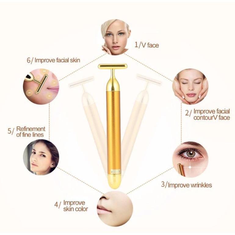 Máy Massage gold với công dụng thúc đẩy sự tuần hoàn máu mặt và trao đổi chất giúp cải thiện hiện tượng natri tự nhiên, chẳng hạn như da nhão, nếp nhăn, nổi cộm gân, dưới mắt sưng phồng vì tuổi tác sẽ bị đánh tan bởi Massage Gold với tần suất rung lên tới 6000 lần/phút