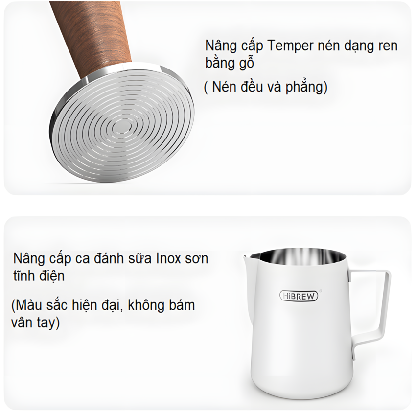 - Bộ phụ kiện bao gồm: 1 máy chủ; 1 tay pha chuyên nghiệp ; x3 phin lọc inox ; 1 tay nén inox 58mm ; 1 ca đánh sữa ; 1 thìa múc bột kiêm bàn chải vệ sinh; 1 sách HDSD