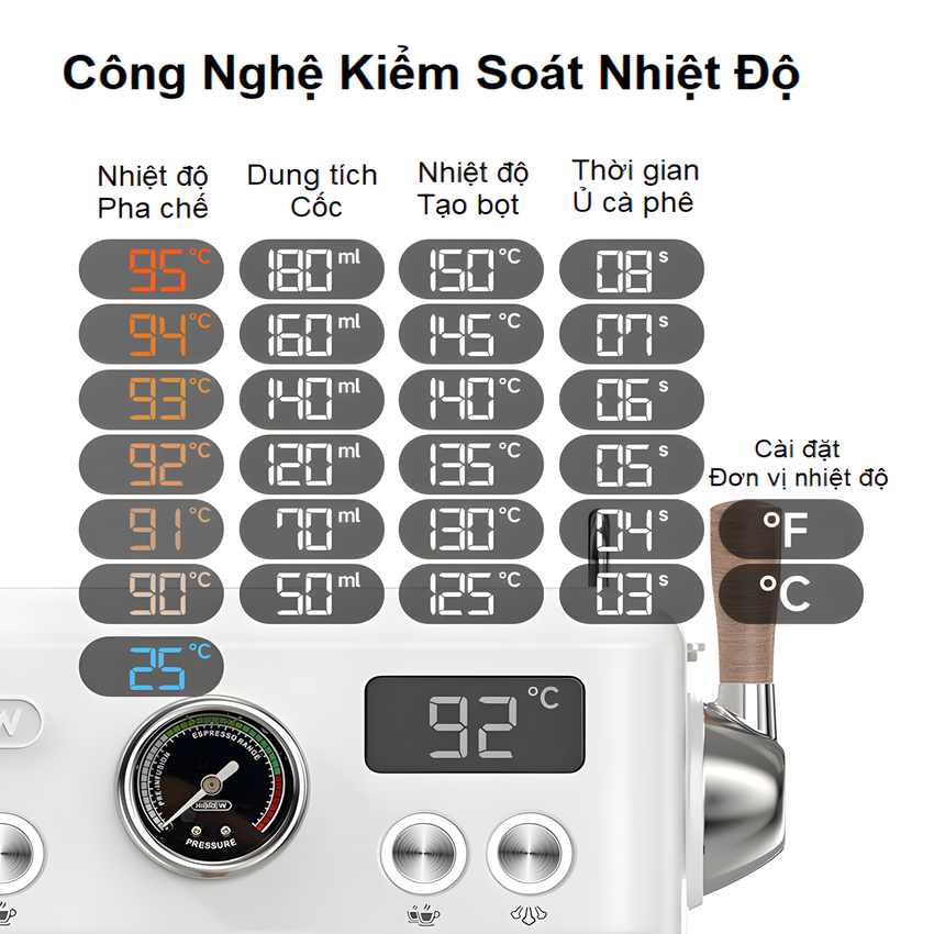 - Linh hoạt kiểm soát nhiệt độ đánh sữa 125~150ºC