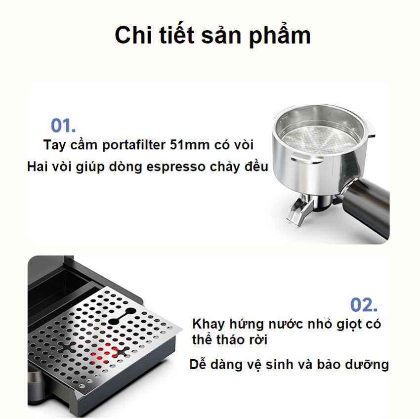 Công suất 1350W Bơm áp lực: 15 bar Dung tích: 1,1L Có thể pha Espresso và Cappuccino Bình chứa nước có thể tháo rời dễ dàng, van an toàn hoạt động linh hoạt giúp bạn