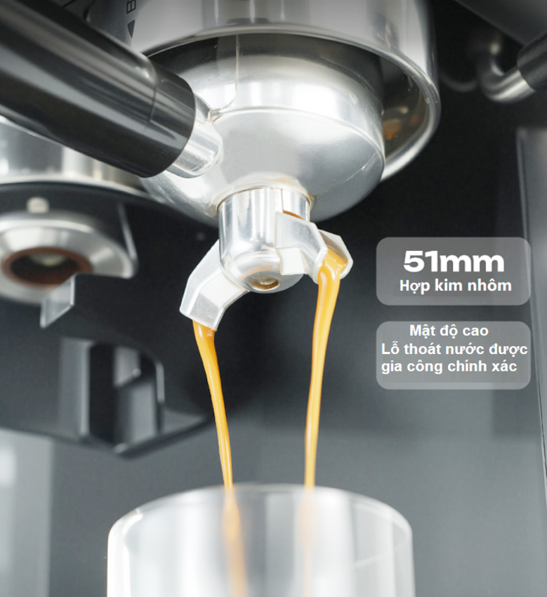 Máy pha cà phê Tahawa TS6212 - Máy pha cafe đa chức năng: Espresso, Cappuccino, Latte. Áp suất bơm: 15 bar - Công suất:1250W - 1450W. Có vòi đánh sữa - Bảo hành chính hàng 12 tháng Thông số kỹ thuật ⦁ Loại máy : Máy pha cà phê gia đình ⦁ Chức năng pha cà phê : Espresso, Cappuccino, Latte ⦁ Áp suất bơm : 15 bar ⦁ Công suất : 1.250W - 1.450W ⦁ Dung tích bình nước : 1 lít ⦁ Vòi tạo hơi : 1 ⦁ Chất liệu : Inox, Nhựa cao cấp ⦁ Nguồn điện áp : 220 - 240V, 50/60Hz ⦁ Trọng lượng sản phẩm : 3,9kg ⦁ Kích thước : 31,2cm x 13,9cm x 30,4cm ⦁ Trọng lượng bao bì : 4,65kg ⦁ Bảo hành : 12 tháng Thông tin sản phẩm Đặc điểm nổi bật của máy pha cà phê Tahawa TS6212 ⦁ Thiết kế nhỏ gọn, được làm bằng inox sáng bóng rất hiện đại. ⦁ Hệ thống ủ nhiệt nhanh chân không, áp suất bơm tối đa 15 bar giúp chiết xuất ra những ly cà phê Espresso thơm ngon, chuẩn vị. ⦁ Trang bị vòi đánh sữa giúp pha Cappuccino, Latte nhanh chóng. ⦁ Trang bị 2 vòi cho phép pha 2 ly cùng lúc, tùy theo nhu cầu sử dụng. ⦁ Điều khiển bằng mạch điện tử PCB đảm bảo nhiệt độ và hơi nước ra chính xác hơn. Máy pha cà phê Tahawa TS6212 là một trong những dòng máy pha cà phê bán tự động nổi bật nhất của thương hiệu Tahawa vừa được ra mắt năm 2022. Với hệ thống pha hiện đại, vòi đánh sữa chuyên nghiệp, Tahawa TS6212 sẽ giúp bạn pha chế Espresso, Cappuccino hoặc Latte thơm ngon, chuẩn vị. Công suất 1.450W, pha chế nhanh chóng Máy pha cà phê Tahawa TS6212 được trang bị công suất hoạt động mạnh mẽ, lên tới 1.450W kết hợp với hệ thống ủ nhiệt nhanh chân không, giúp pha chế cà phê vừa nhanh, vừa chuẩn vị. Đặc biệt, chiếc máy này có áp suất bơm khá mạnh, tối đa 15 bar nên chỉ trong thời gian ngắn, nước có thể thẩm thấu nhanh chóng qua bột cafe và chiết xuất ra những hương vị tinh túy nhất của cafe. Pha được Espresso từ nguyên liệu bột cà phê Tahawa TS6212 là dòng máy pha cafe bán tự động nên nguyên liệu mà máy sử dụng là bột cà phê. Vì thế, bạn cần sử dụng cà phê bột xay sẵn hoặc trang bị thêm máy xay cà phê. Với tay cầm và bộ lọc filter đi kèm, bạn sẽ dễ dàng pha cho mình một ly Espresso thơm ngon và có lượng cream đạt chuẩn. Trang bị vòi đánh sữa giúp pha Cappuccino, Latte nhanh chóng Ngoài khả năng pha Espresso, máy pha cafe tự động Tahawa TS6212 còn có khả năng pha chế Cappuccino, Latte... nhờ bộ phận vòi đánh sữa chuyên nghiệp. Bạn có thể điều chỉnh được áp lực bơm để tạo độ mịn của bọt sữa tùy theo nhu cầu của đồ uống. Dung tích bình chứa 1 lít, tiết kiệm thời gian pha chế Bình chứa nước của máy pha cà phê Tahawa TS6212 có dung tích 1 lít, giúp bạn có thể pha được nhiều cốc cafe liên tục mà không phải châm thêm nước thường xuyên. Bên cạnh đó, bình chứa nước của máy cũng có thể tháo rời nên việc vệ sinh sẽ dễ dàng và đảm bảo hơn. Trang bị 2 vòi cho phép pha 2 ly cùng lúc, tùy theo nhu cầu sử dụng Máy Tahawa TS6212 là dòng máy pha cafe 2 vòi với 2 đầu chảy riêng biệt, giúp bạn có thể pha chế 2 ly cà phê cùng một lúc, nhờ đó tiết kiệm được thời gian pha chế. Điều khiển bằng mạch điện tử PCB đảm bảo nhiệt độ và hơi nước ra chính xác hơn Việc đảm bảo nhiệt độ ổn định và hơi nước ra chính xác có vai trò rất quan trọng quyết định đến chất lượng ly cafe pha bằng máy. Vì thế, máy pha cà phê bán tự động Tahawa TS6212 được trang bị mạch điện tử PCB giúp nhiệt độ và hơi nước được cung cấp tốt nhất, mang tới ly cà phê thơm ngon, chuẩn vị.