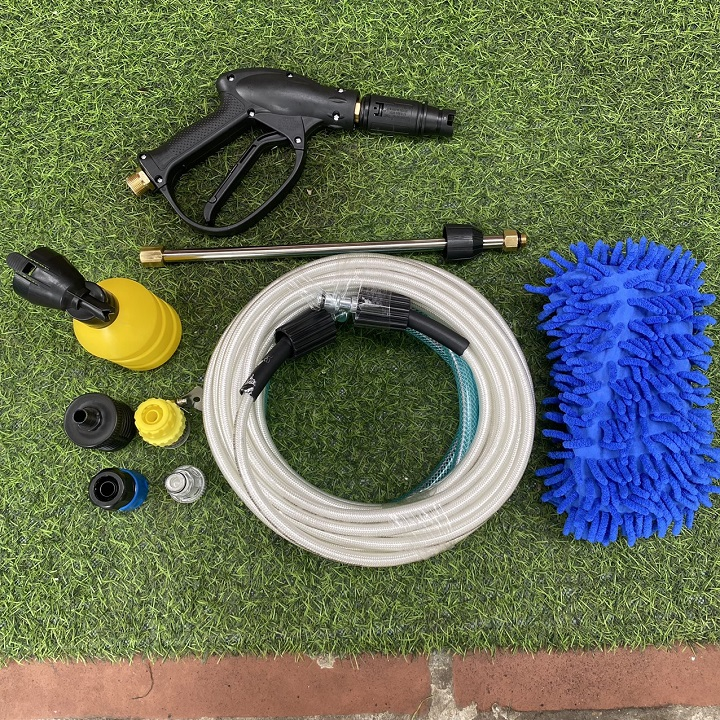 Máy đi kèm với nhiều phụ kiện hữu ích, như súng phun xịt có thiết kế đầu phun có thể điều chỉnh độ xòe của nước. Chế độ xịt rửa áp lực cao và chế độ phun sương cho phép bạn linh hoạt trong việc sử dụng máy cho nhiều mục đích khác nhau, từ làm sạch đến tưới cây.
