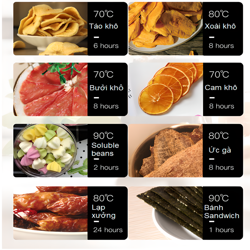 - Sấy rau củ với biên độ nhiệt từ 40- 60°C: nếu bạn là tín đồ của các món ăn vặt sấy dẻo, thì việc chế biến các món như cà rốt, xoài, ổi, dứa, mít, tỏi ( tỏi đen)…