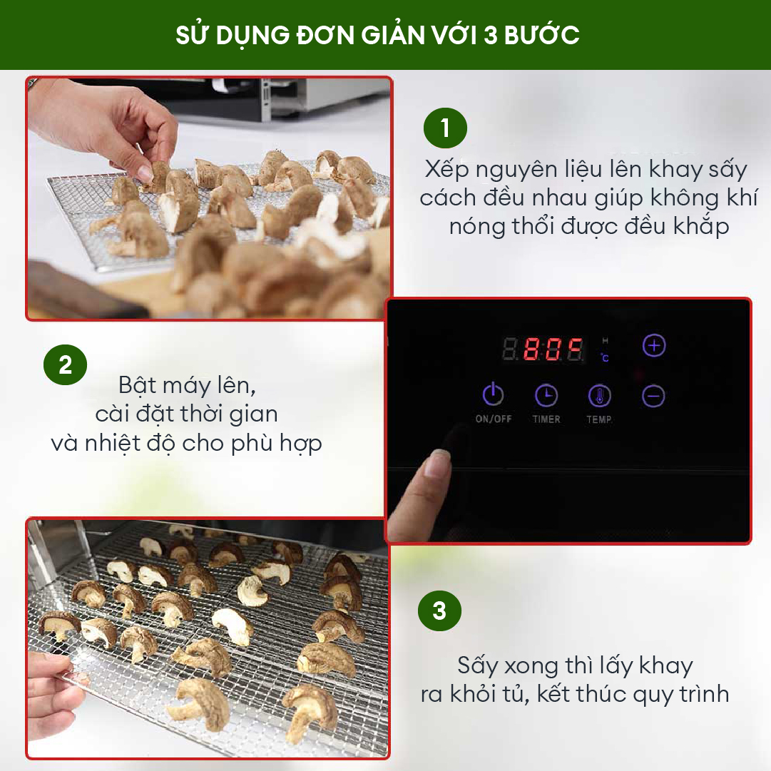 - Dễ sử dụng nhờ hộp điều khiển thông minh, có thể cài đặt nhiệt độ và thời gian cho cả quy trình sấy